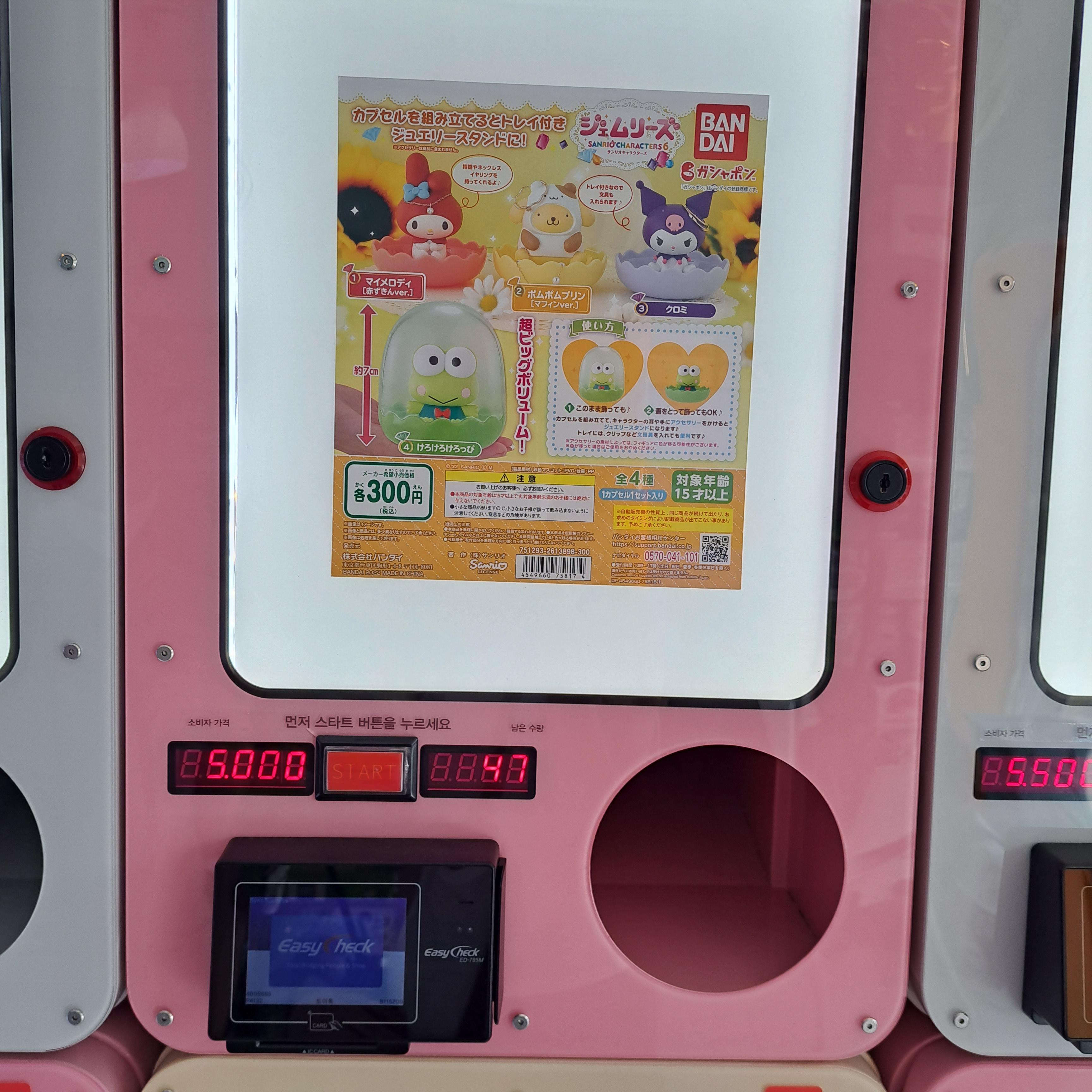 폼폼푸린, 리틀트윈스타 라라,키키, 마이멜로디, 시나몬롤 많더라.. 가챠 기계 4~5개 정도는 보였던 것 같음.