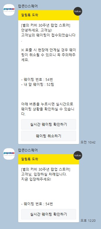이런식으로 카톡과 연동해 알려줍니다. 상품이 계속 채워지고 있으며 별을 타고 있는 커비인형 (말랑말랑 커비 쿠션) 은 8월 초중순에 재입고 된다는 소식을 점원피셜로 들었습니다. 그리고 나머지 상품들도 계속 들어올거에요.