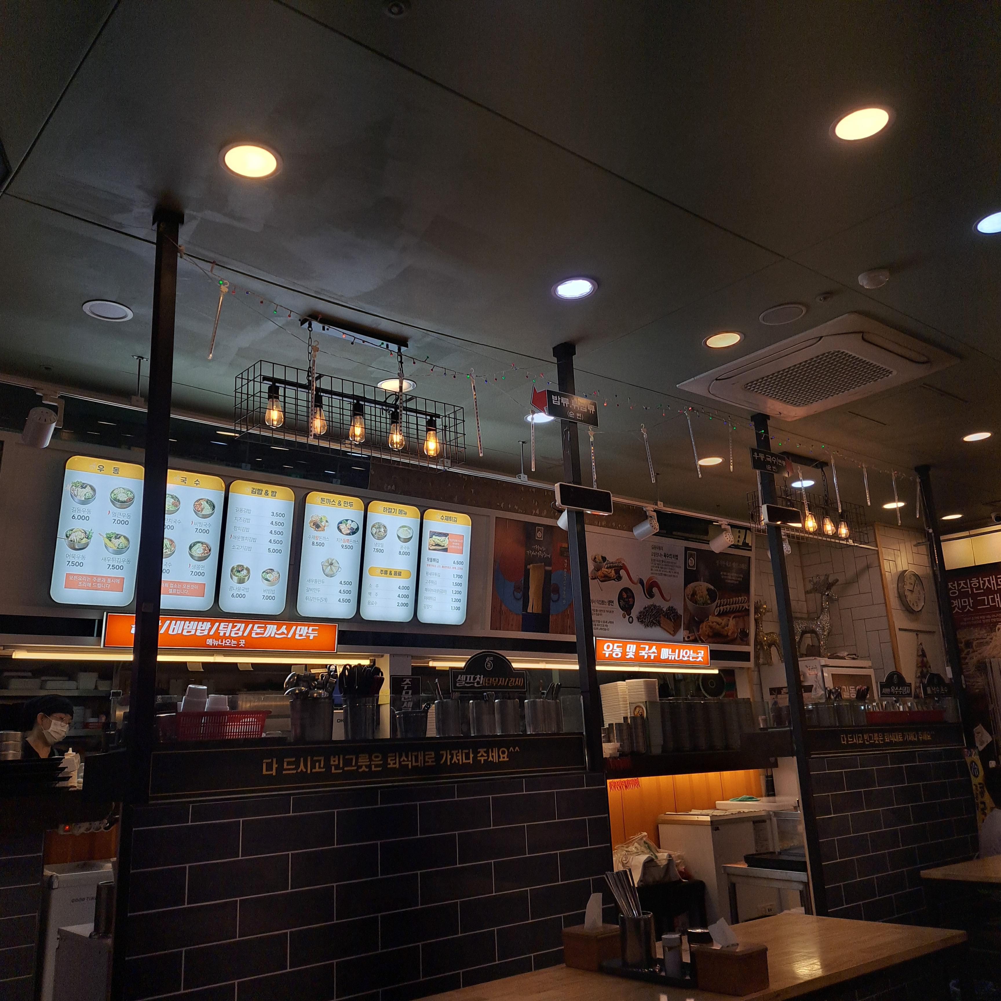 나름 ? 넓고 구조가 잘 되어 있던 곳이었다. 키오스크에서 주문을 하고 번호표를 받으면 자리에 앉아 기다림. 얼마 안걸려서 바로 나오더라. 음식이 나오는 곳이 2군데가 있는데 이모님들이 번호를 불러 주신다. 사람이 많은 시간엔 띵동을 해주나봄 ㅇㅇ 전광판 있음. 그리고 우동과 국수는 같은 곳에서, 나머지 돈까스,만두,비빔밥,김밥은 옆에서 따로 나온다. 주문을 섞어해도 번호를 불러줬던 것 같음. 저기서 하나 픽업, 다른곳에서 하나 픽업이다. 음식 받기 전에 트레이 뽑아서 펼쳐주고 수저 챙기면 됨.