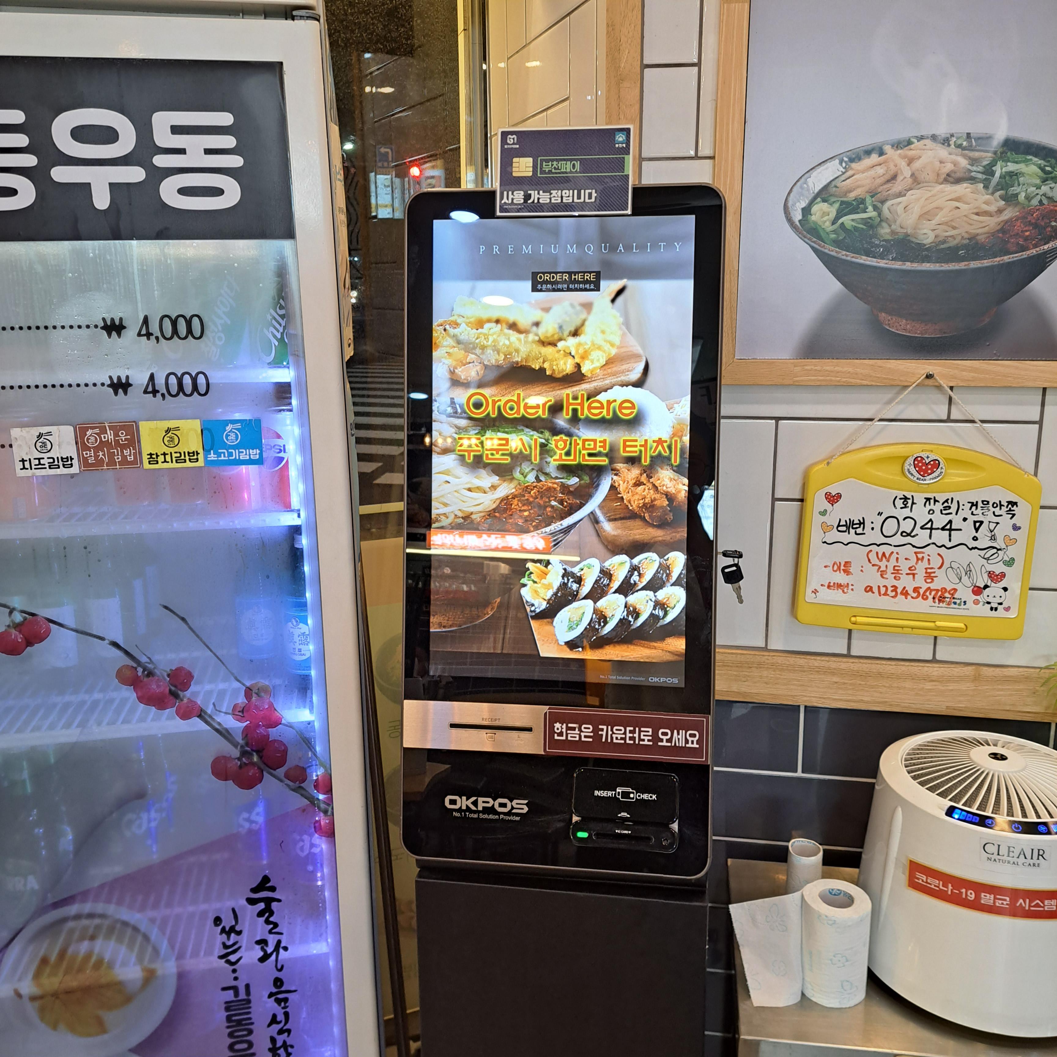 사진 기준 왼편에 주방 이모님들이 계시고 주문이랑 결제는 모두 셀프/키오스크로 진행됨.