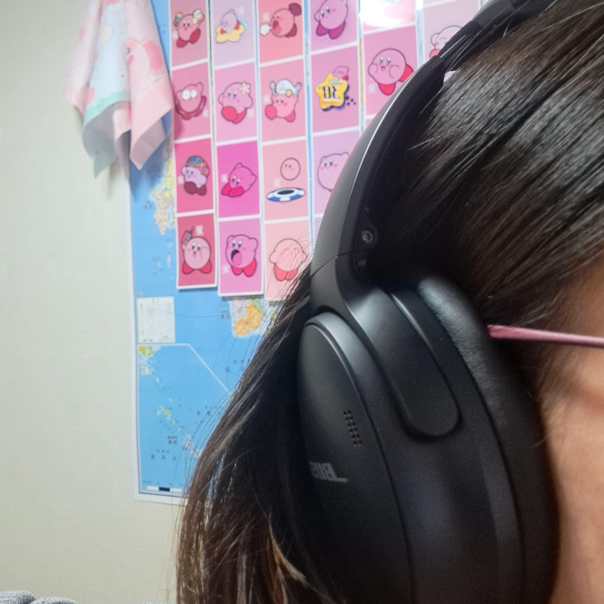 이게 귀 부분 스펀지(이어패드)가 매우 말캉하고 쫀쫀해서 안경테부분을 아프게 누르지 않는다. 귀는 잘 덮어주면서 안경테는 누르지 않음. 가벼운 끄덕임정도에 안경이 움직이지도 않고 헤드폰도 움직이지 않는다. 기침하면 살짝 움직이긴 함. 소니가 이어패드가 크다고 해서 혹 했었는데 (더 잘 덮어줄것 같아서) 보스 사이즈여도 나쁘지 않는 듯.