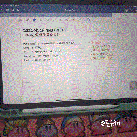 - 스캔 한 책을 보며 문장 끊어읽기를 표시해본다. 몰랐던 단어도 찾아서 굿노트에 적어놓는다.