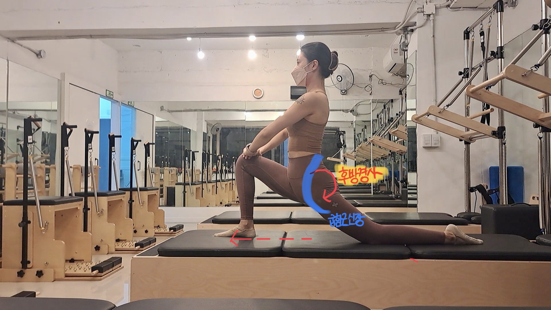- 뒤로 뻗은 다리의 뒤꿈치가 바닥에 닫는다면 비복근(장딴지근)의 스트레칭도 가능해진다. 하지만 고관절 앞부분의 신장만 원할 경우 뒤꿈치를 바닥에서 떼어도 괜찮다.