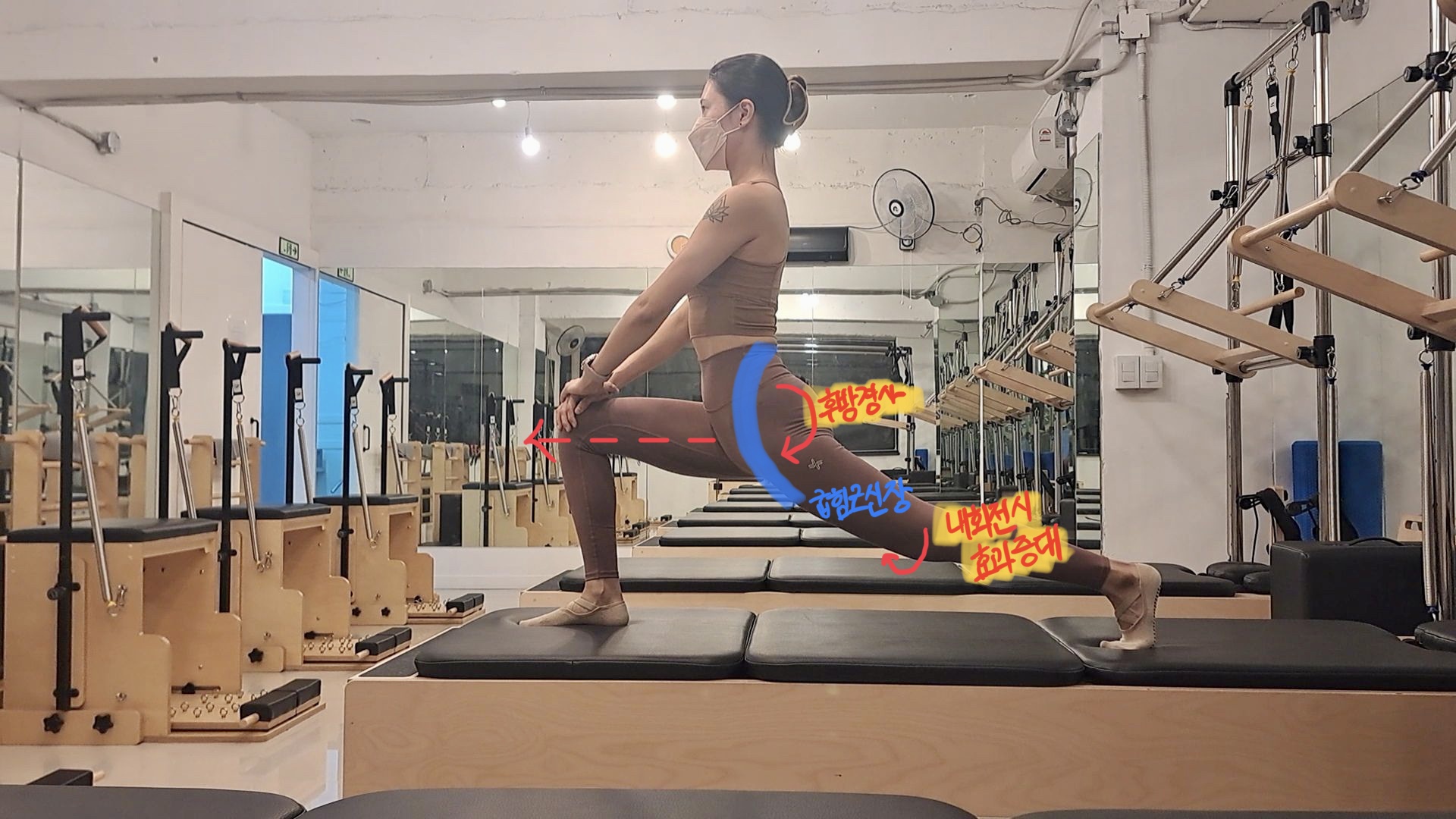 - 뒤의 다리를 고관절 내회전을 시켜준다면 조금 더 많은 고관절 굽힘근의 신장을 도울 수 있다. 이는 장요근의 기능 중 하나인 고관절 외회전과 반대대는 모양을 만듦으로써 더욱 신장을 도울 수 있기 때문.