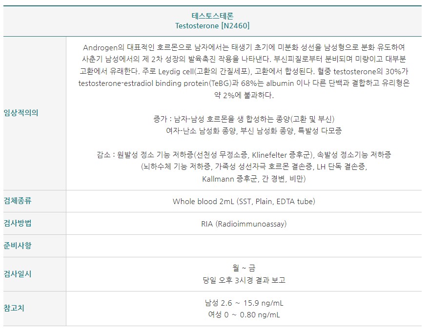 - 테스토스테론 : 59.04 ng/dl (=0.59 ng/ml)