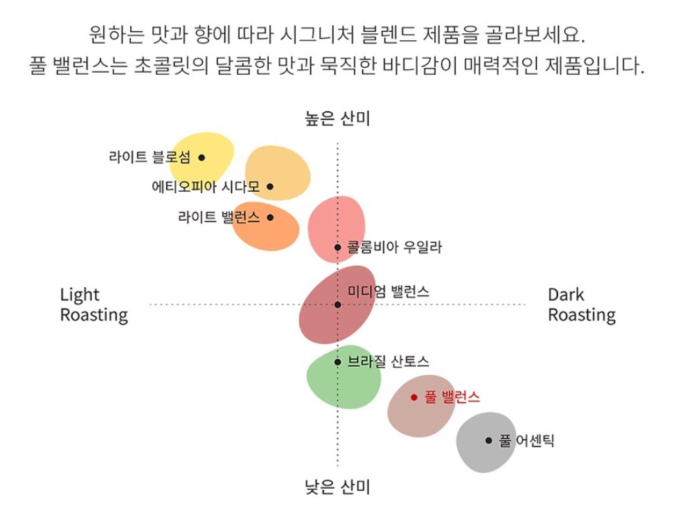 원두는 과테말라산 40%, 코스타리카산 40%, 콜롬비아산 20% 국내 식품 대기업인 동서식품에서 나왔다. 대기업 제품의 장점은 바로 어딜가나, 어떤 제품을 사나 맛이 일정하게 똑같다는 것이 장점이다. 괜히 사람들이 맥심커피믹스를 마시는게 아니다..어떤 포장지를 뜯어도 똑같은 맛이 나는 대기업의 맛, 단점은 마케팅비용이나 연구비용이 많이 들어가서 가격에서 차이가 나는거 정도? 가격은 1kg 2만1천원.
