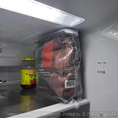 커피머신에 털어넣고 나머지는 밀봉해서 냉장 보관중인데 대기업이라 그런지.. 포장지가 특이했음. 보통 지퍼백으로 많이 나오는데 이것도 지퍼백으로 되어있다. 근데 윗부분은 보통 가위로 잘라서 지퍼백을 잠그거나 손으로 찢어야하는데 이건 예쁘게 찢도록 손잡이가 나와있다. 그래서 가로로 쭈욱 뜯으면 바로 지퍼백이 나온다. 뭐 큰건 아니지만 단정한걸 좋아하는 사람들이 기뻐할 디테일이다. 이번에도 비닐백 냉동 소분할까했는데 별 차이를 모르는 나는 그냥 지퍼백에 한번 더 싸서 냉장 보관하기로 함.