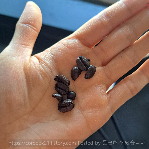 이전에 먹었던 원두는 워낙 라이트 로스팅이여서 엄청 건조해보이고 수분만 날라간 가벼운 원두라면 이 원두는 뭔가 응축된 그런 느낌의 원두다. 커피를 논할만한 지식이 있는건 아니지만 이런걸 바디감이라고 하려나?ㅋㅋㅋ 무게가 뭔가 더 무거운 느낌이 난다. 볶아내면 수분이 다 날아가는데 왜 더 무거워지는거지... 아무튼 원두를 손으로 잡으면 기름이 묻어나온다. 그 손을 냄새맡아보면 풀 태운 냄새인 담배냄새가 난다ㅋㅋㅋㅋㅋ ㅜㅜㅋ 근데 맛있다고!!!!