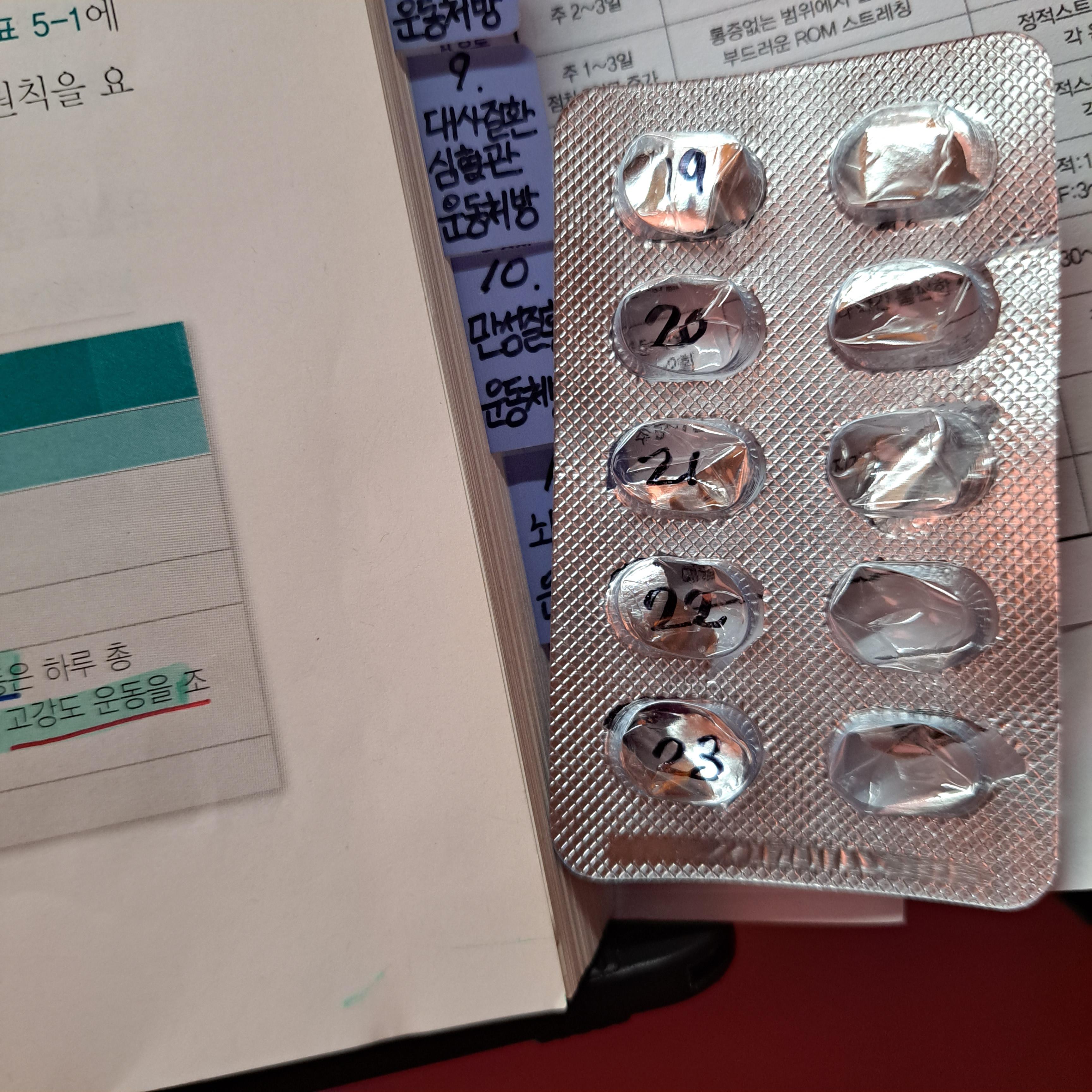 - 초반 10일간 먹지 않아 부족한 복용양(200mg=10알)과 소수점 때문에 약간 더 채워야하는 복용량(80mg)을 초반이 덧붙여 복용. (12알)