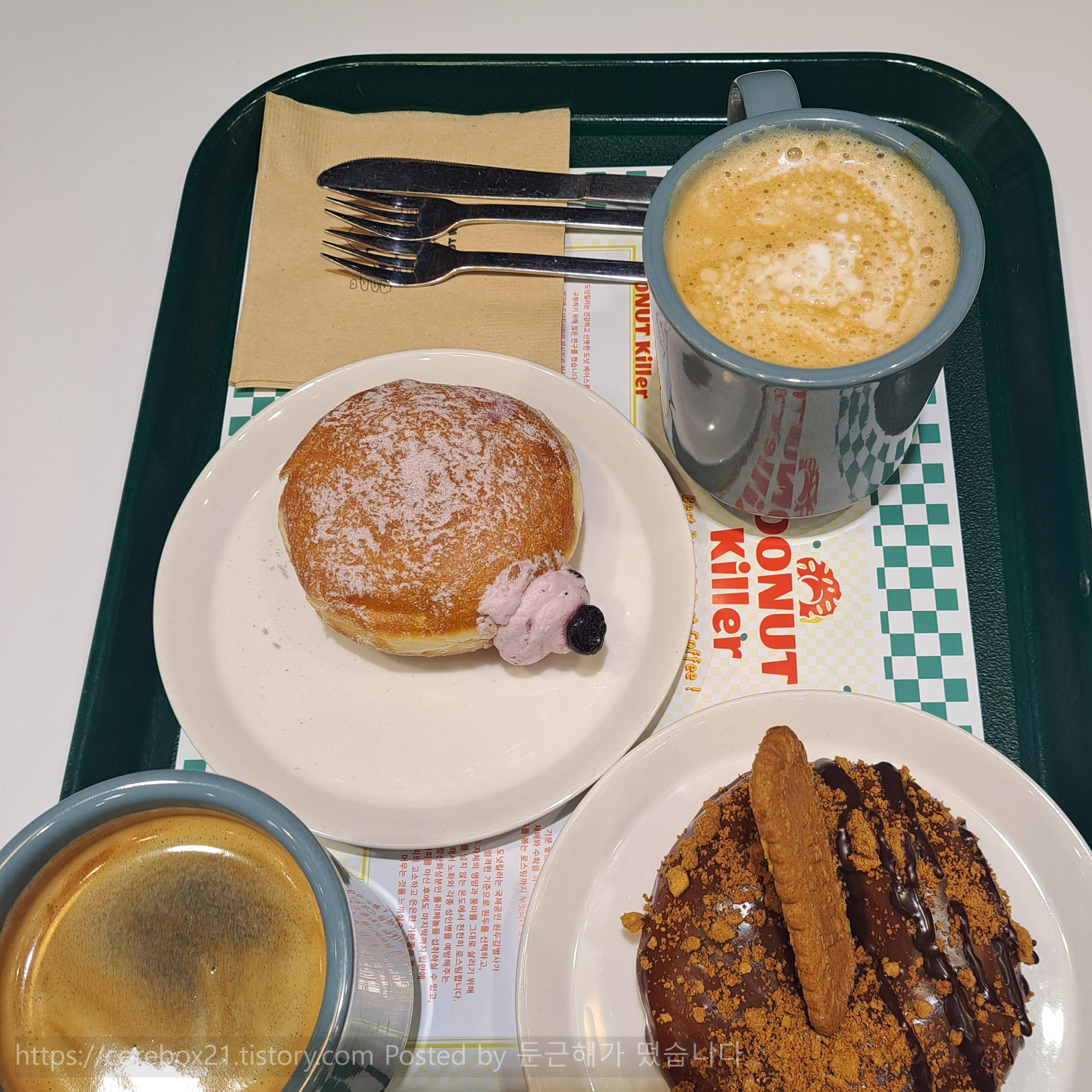 도넛킬러에서 먹은 바닐라라떼, 뜨아, 블루베리 도넛과 로터스 도넛. 도넛은 은근 맛있었음ㅋ.ㅋ...