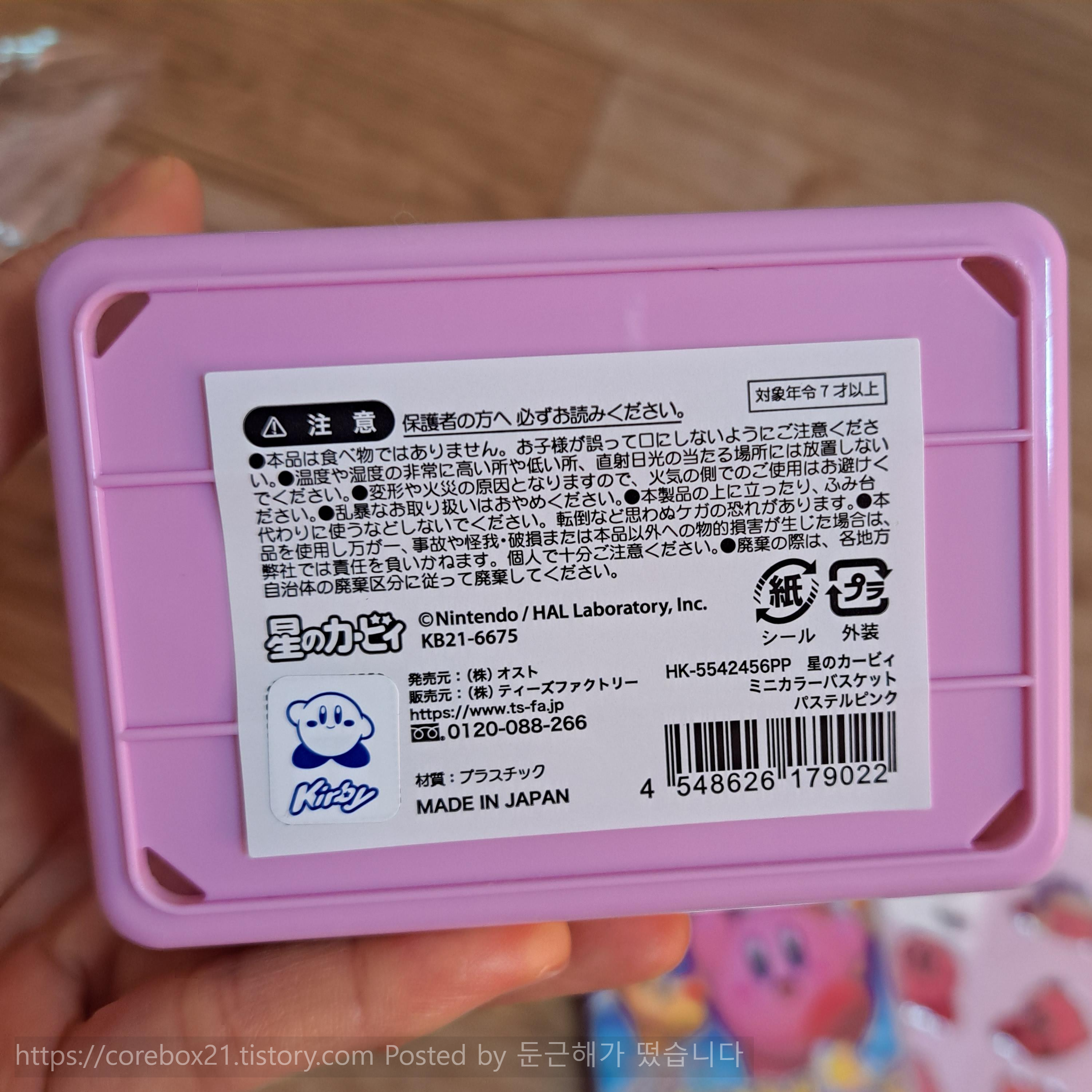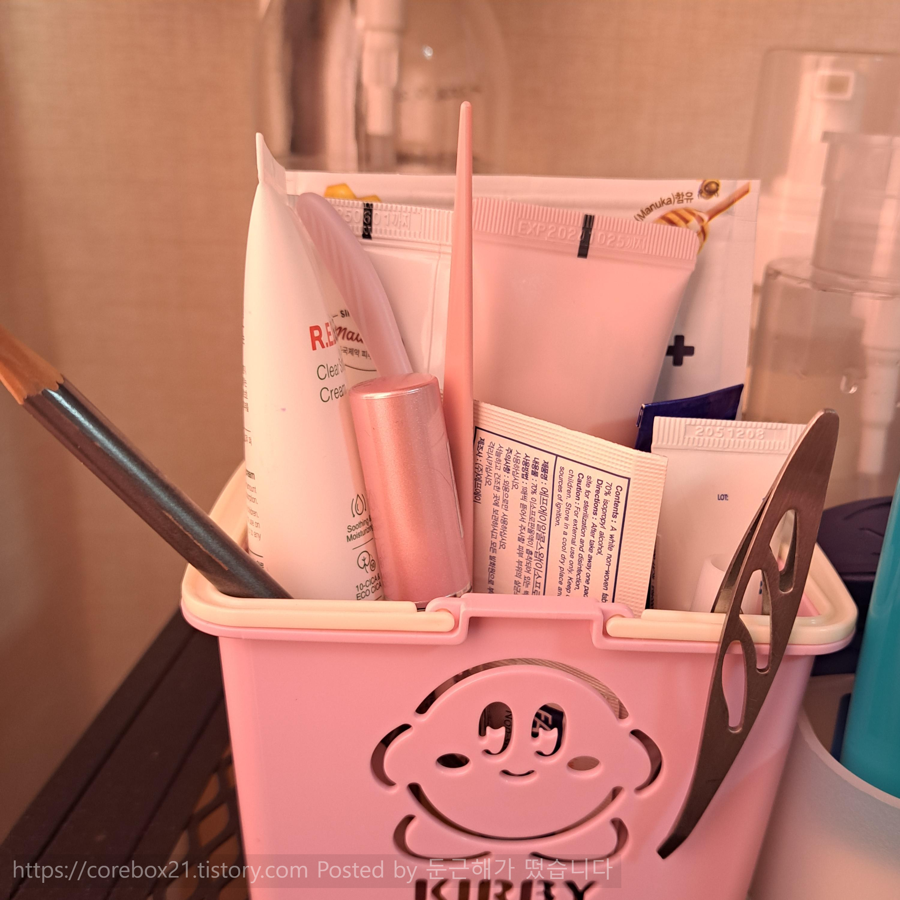 사은품인데 큰거 기대한 흐구 없제? 이거 한 4천원? 하는 듯. 쪼꼬미한거 준다. 그런데 나는 키링보다 더 쓸모가 있다고 생각함. 화장품 소쿠리로 사용중. 좋아조아 이런 실용적인 크비쨩 조아 얘는 일본산 커비네 ㅋㅋ