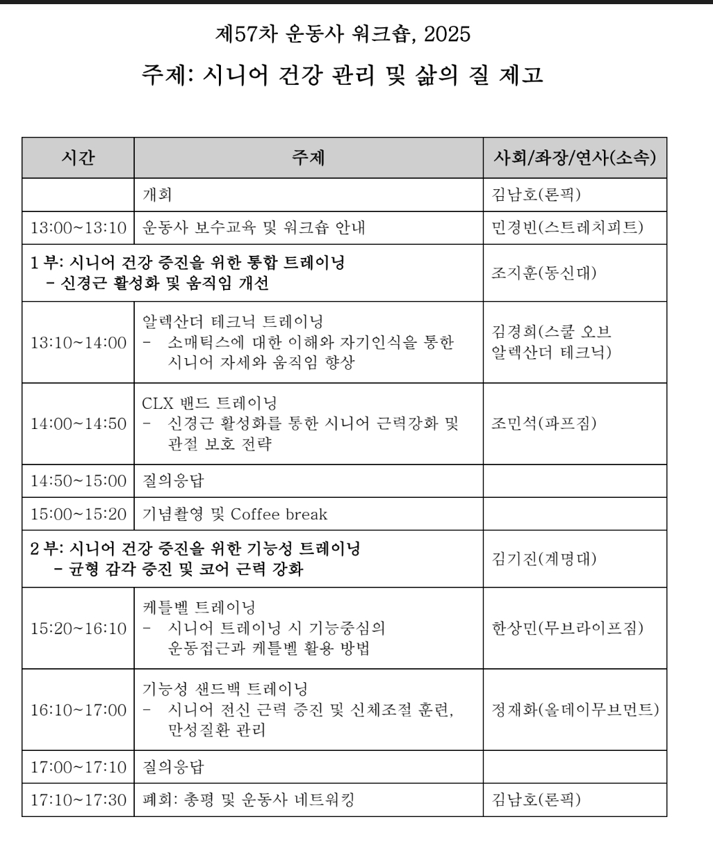 3. 오후일정 제57차 운동사 워크숍 주제 : 시니어 건강 관리 및 삶의 질 제고