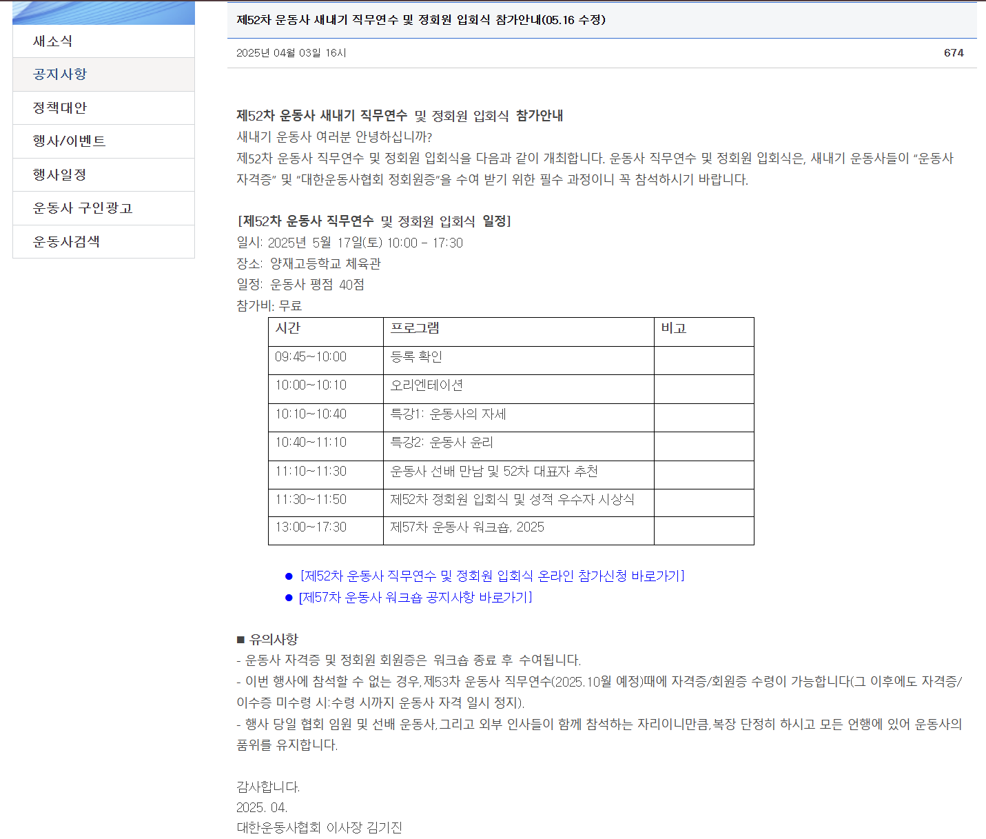 대한운동사협회 홈페이지, 공지사항에 보면 새내기 운동사 직무연수 및 정회원 입회식 참가안내사항이 나온다.