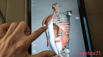 2. 근육의 층을 볼 수 있음. 예를 들어 복근이 쥰내 겹겹히 쌓여있는데 말로만, 설명으로만 들었지 근육층 버튼을 타타탁 눌러보면서 보니까 복횡근-복직근-내복사근-외복사근 순으로 '어떻게' 덮여져있는지 볼 수 있어서 넘나 좋았다. 스캐퓰라 경우 언제나 봐도 신기하고 충격적인 비쥬얼이다.