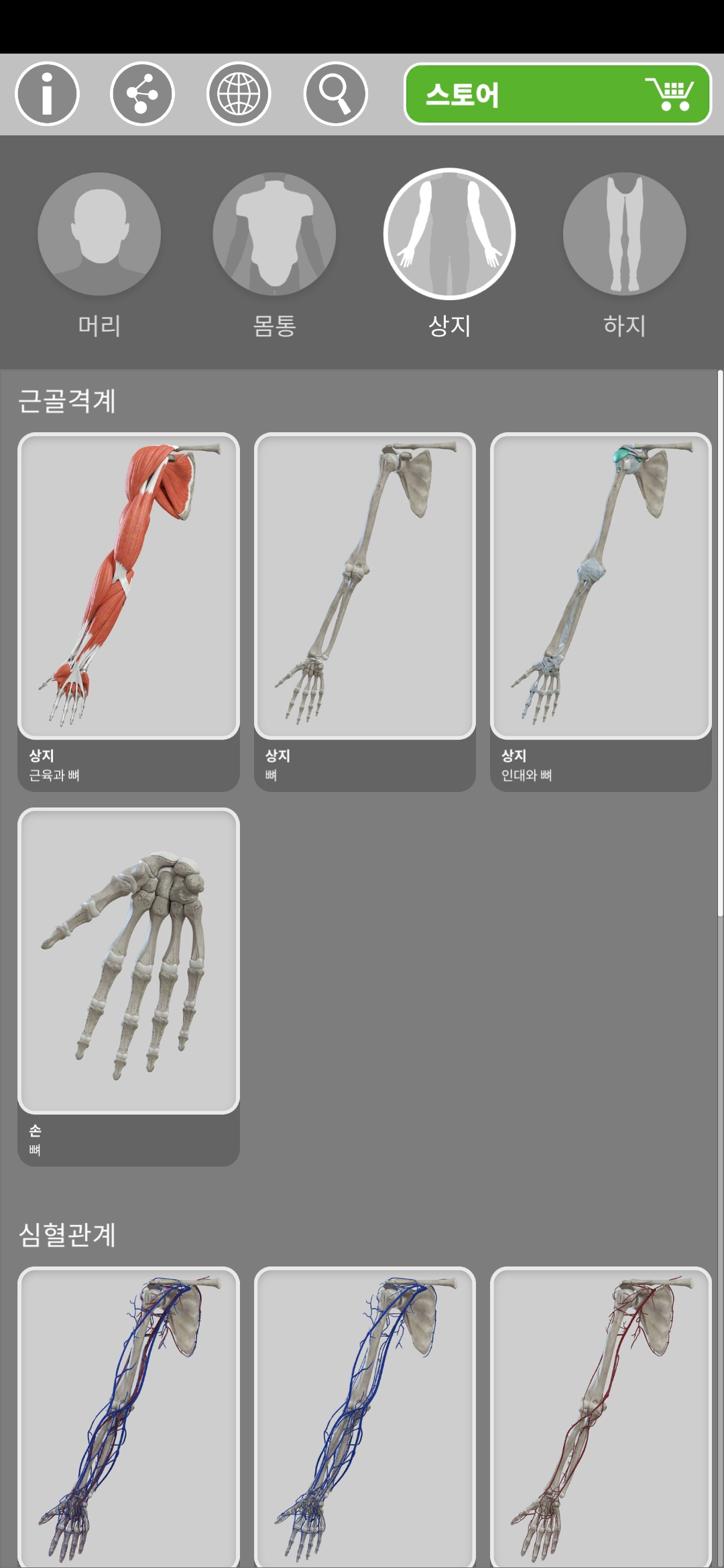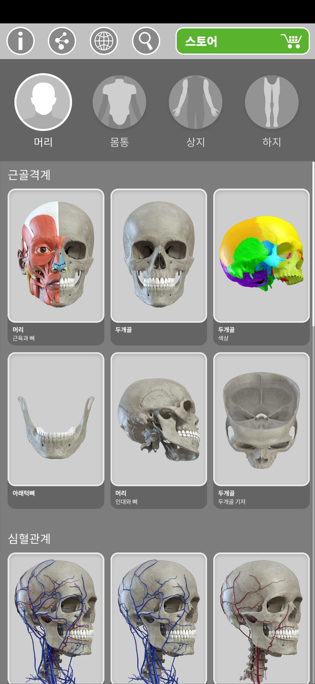해부학 3D 아틀라스 어플은 무료와 유료 버전이 있다. 무료버전은 별로 도움이 안된다. 유료버전은 2단계가 있다.