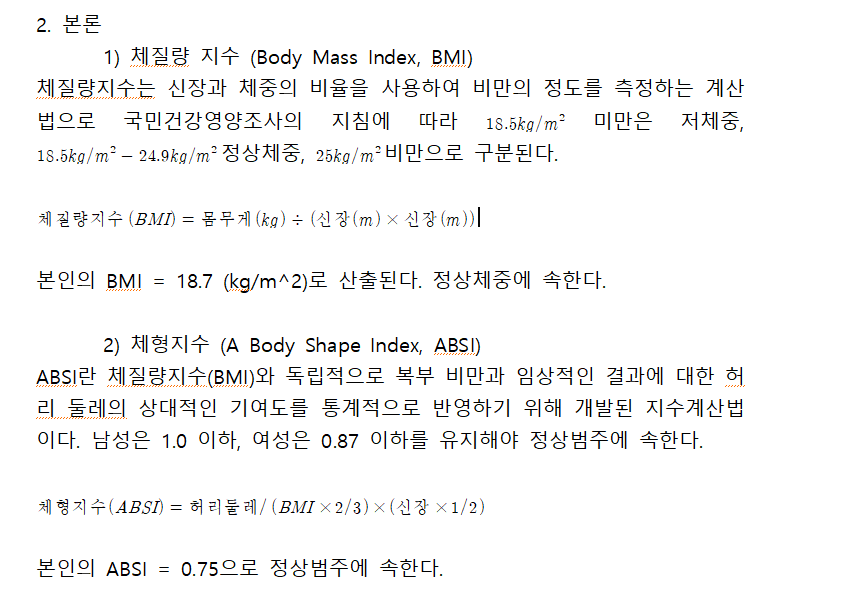 주제 : 본인의 체형에 대해 여러 학자들의 근거나 지수계산법에 의해 평가 기술하기