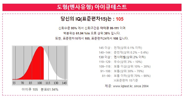 아이큐테스트, 나이별 IQ 테스트 측정, 검사 문제 결과 및 나라별 평균 아이큐 제공