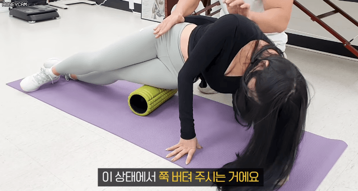 운동 후 폼롤러를 이용해 정적 스트레칭(쿨다운) + 심호흡 해주면
