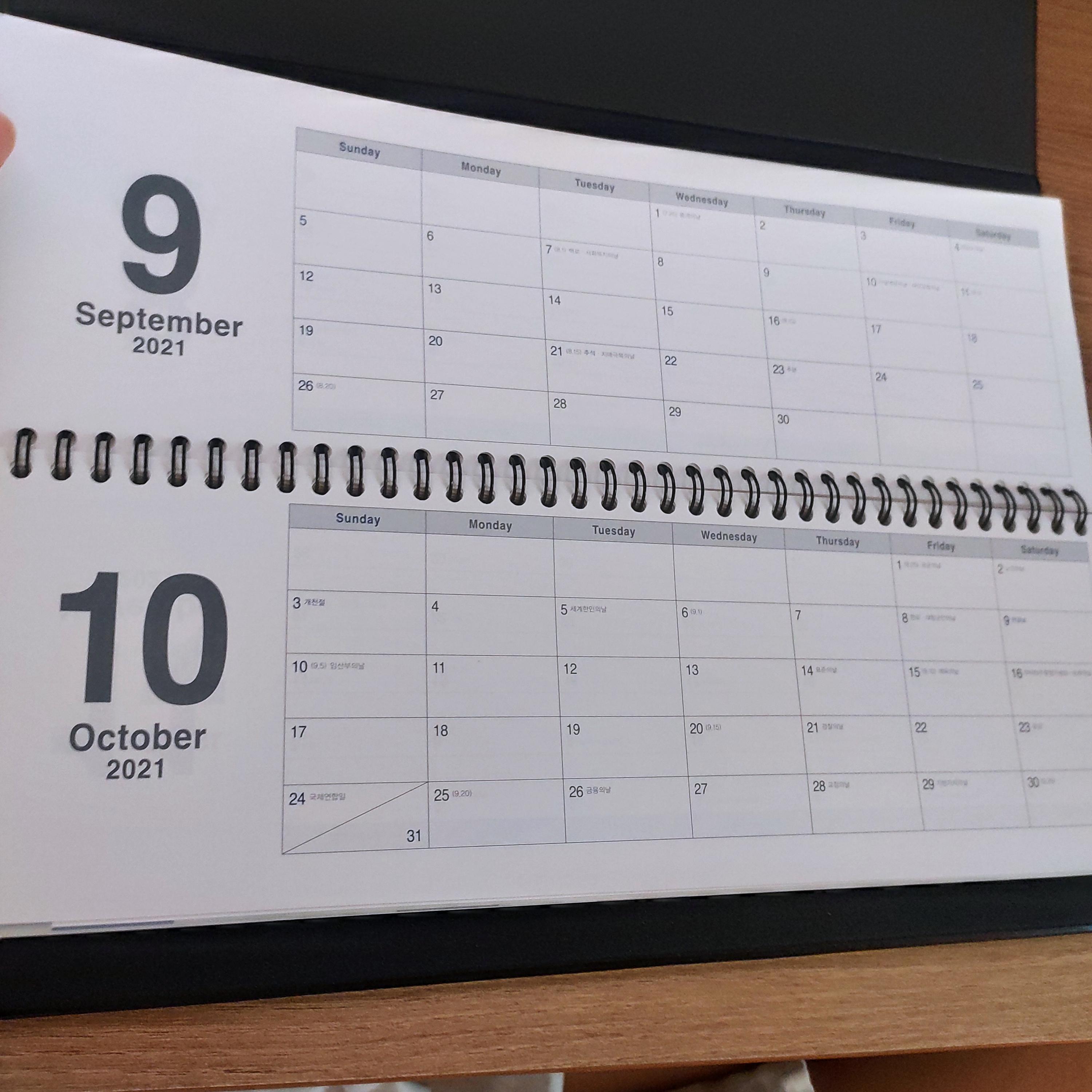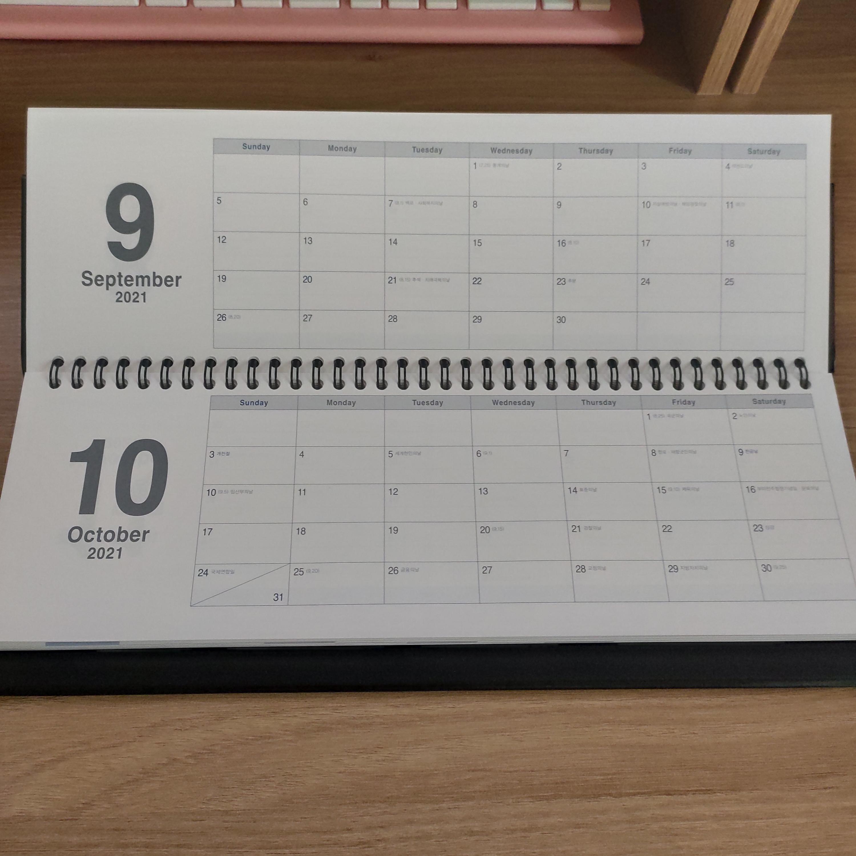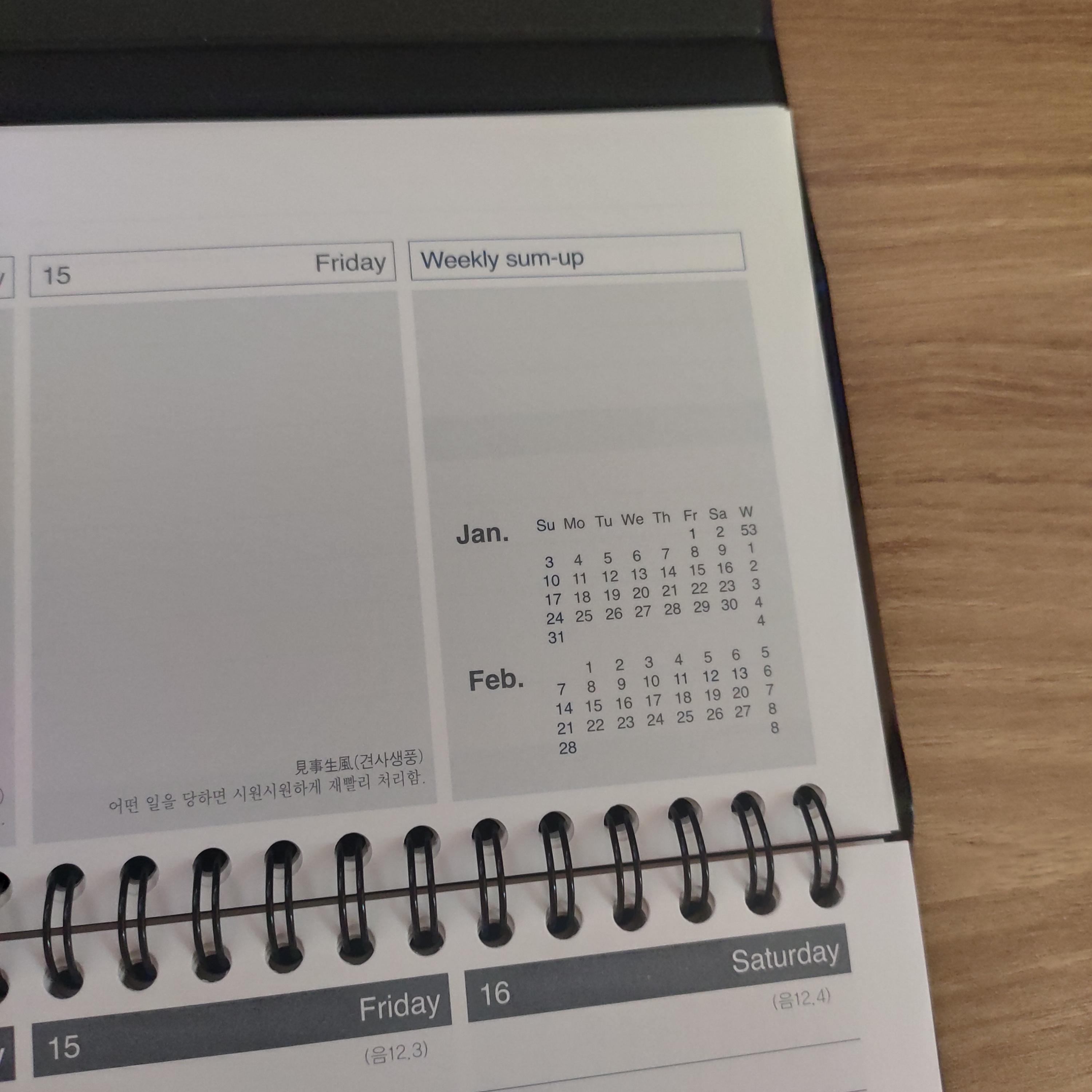주간 무지면에 토요일과 일요일같은 한칸으로 모여있고 주말에는 업무가 보통 없으니 그냥 한 주 요약이나 중요했던 일들을 적어놓는 칸이 있다. 거기에 작은 달력 2개월치가 들어가있음.