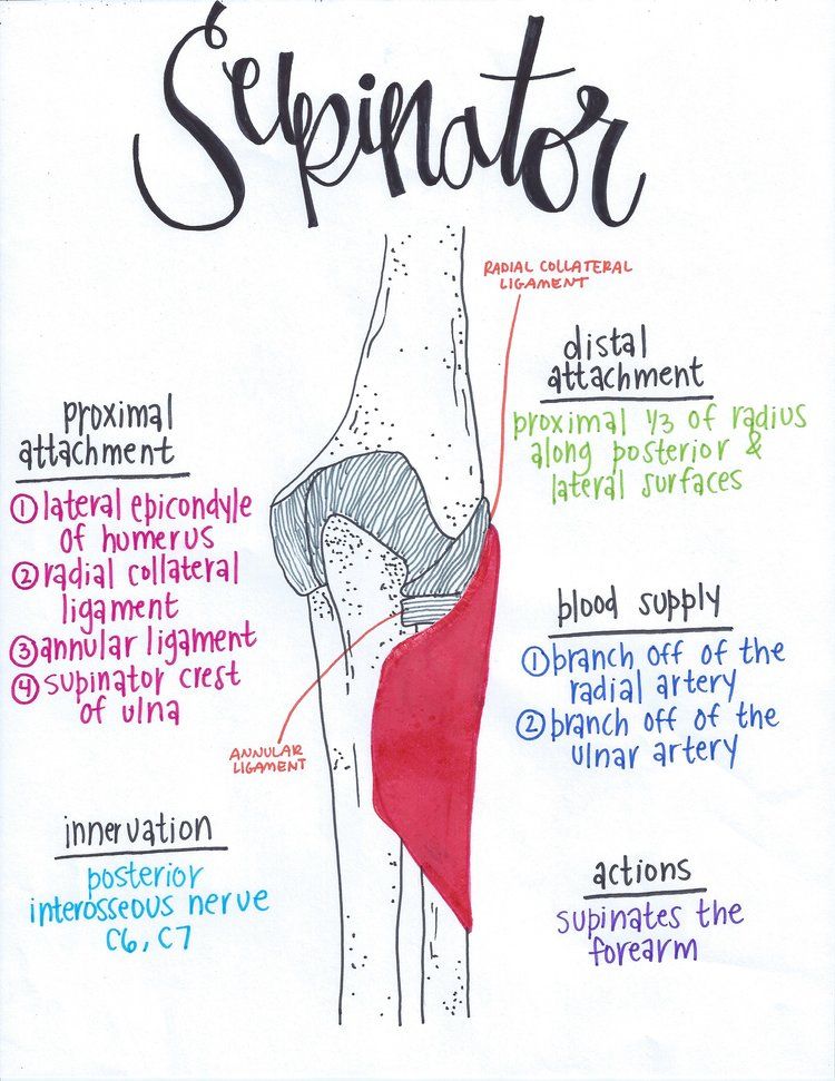 래터럴 에피칸다이얼 오브 휴머러스, 수피내터 크레스트 오브 얼나/상완골 외측상과(가쪽위관절융기), 척골의 회외근능(뒤침근능)