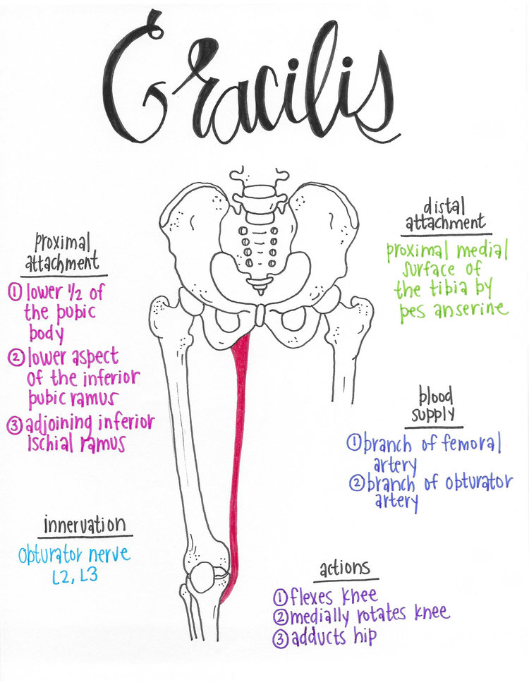2) insertion : Proximal medial surface of the tibia by the pes anserine(=거위발건)/경골의 내측 상부