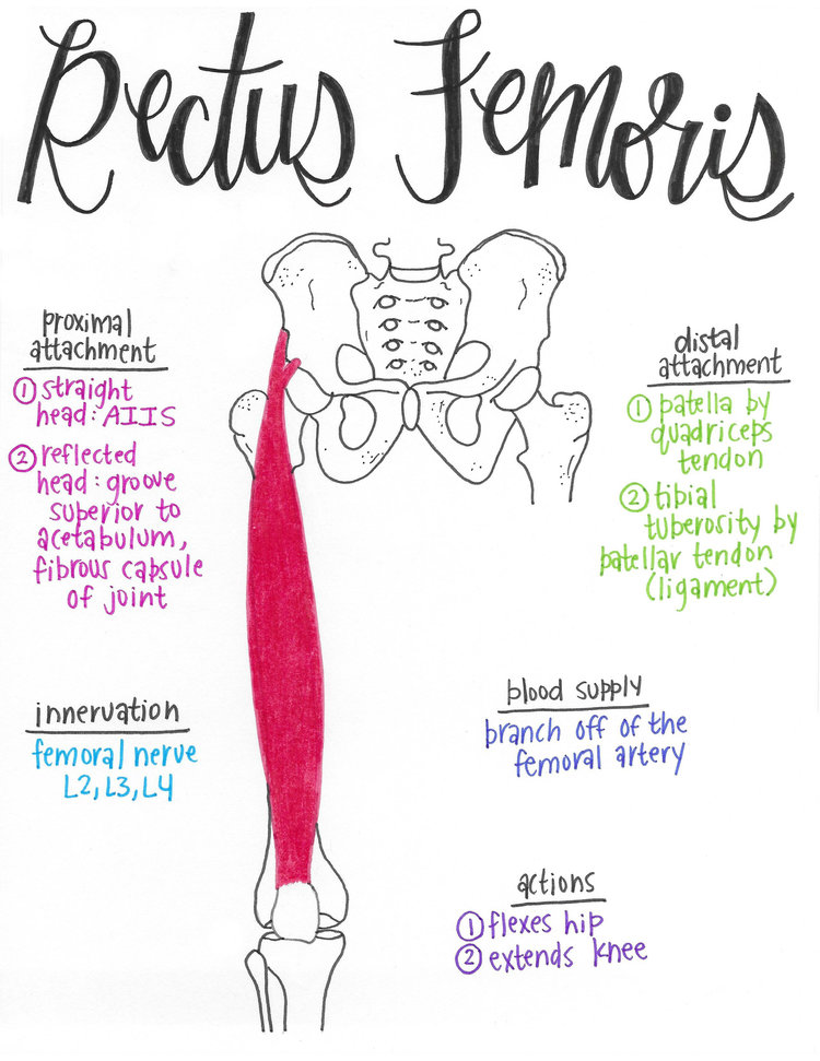 3) action : 우선 고관절에 붙어서 앞쪽 대퇴를 지나가므로 고관절 굴곡과 고관절에서 시작해 무릎을 거쳐가므로 무릎관절 신전