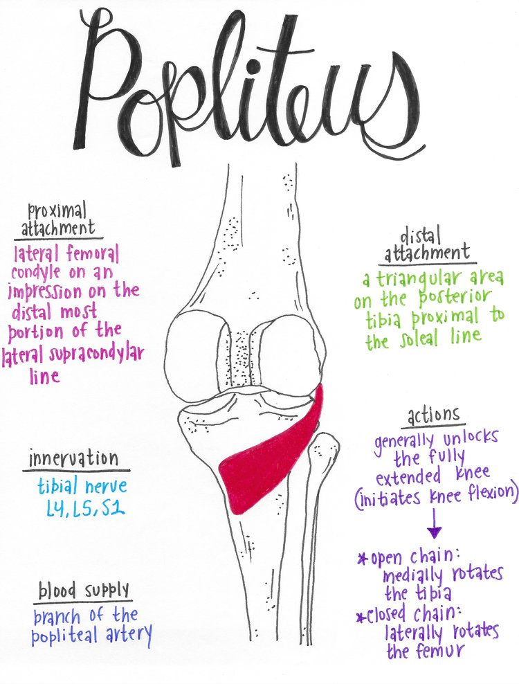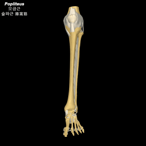 신전된 슬관절을 풀 때 경골을 내회전시켜 무릎을 굴곡하게 만듬.