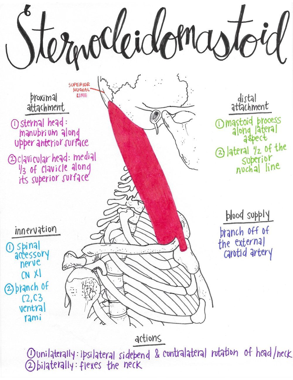 잘 잡히는 목덜미랄까? 고개를 왼쪽으로 까딱해보면 오른쪽에 당기는 근육이 흉쇄유돌근이다. 잘 만져질 거다.