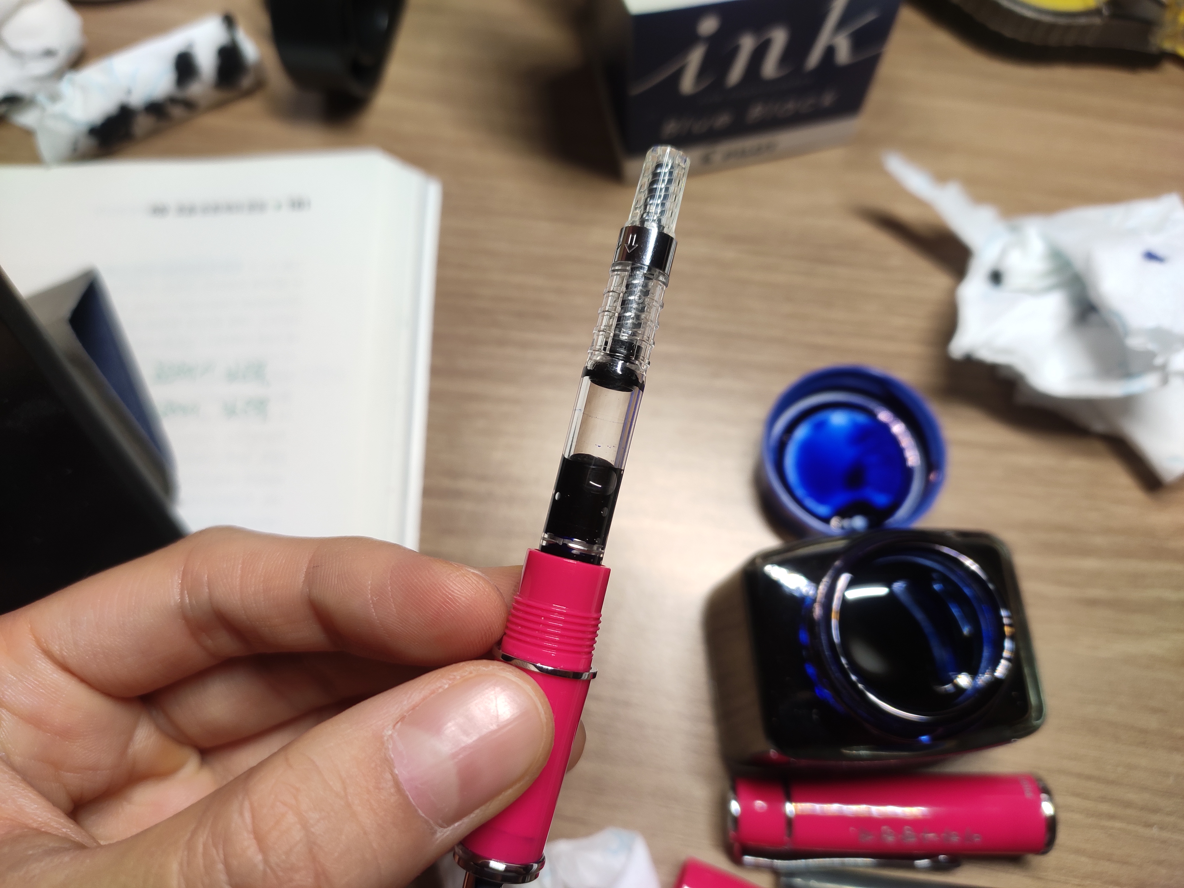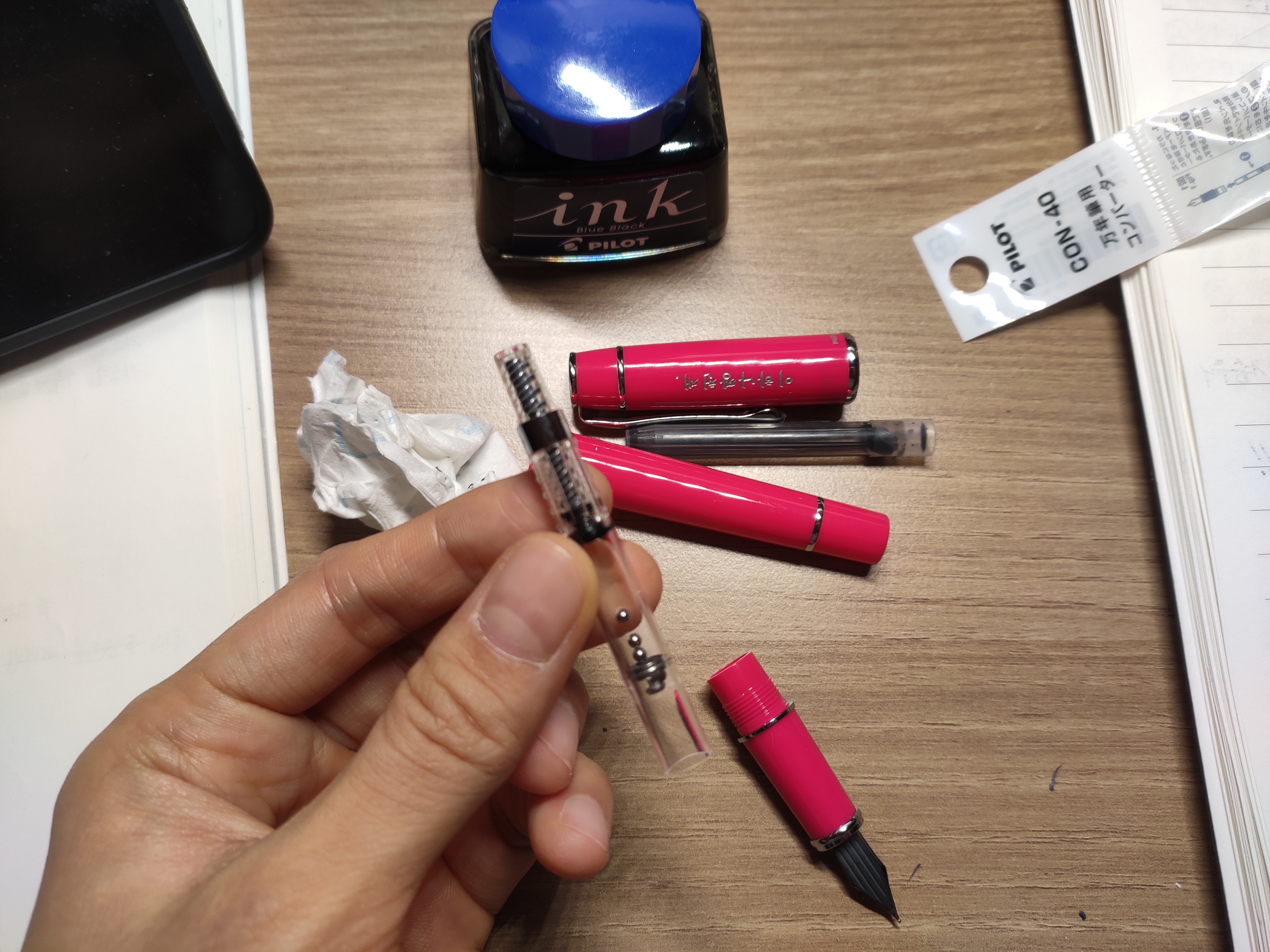 검정 카트리지를 뽑고 최대한 닙과 카트리지 입구쪽에 잉크를 닦아낸뒤 저렇게 컨버터를 바디에 합체시켜준다.