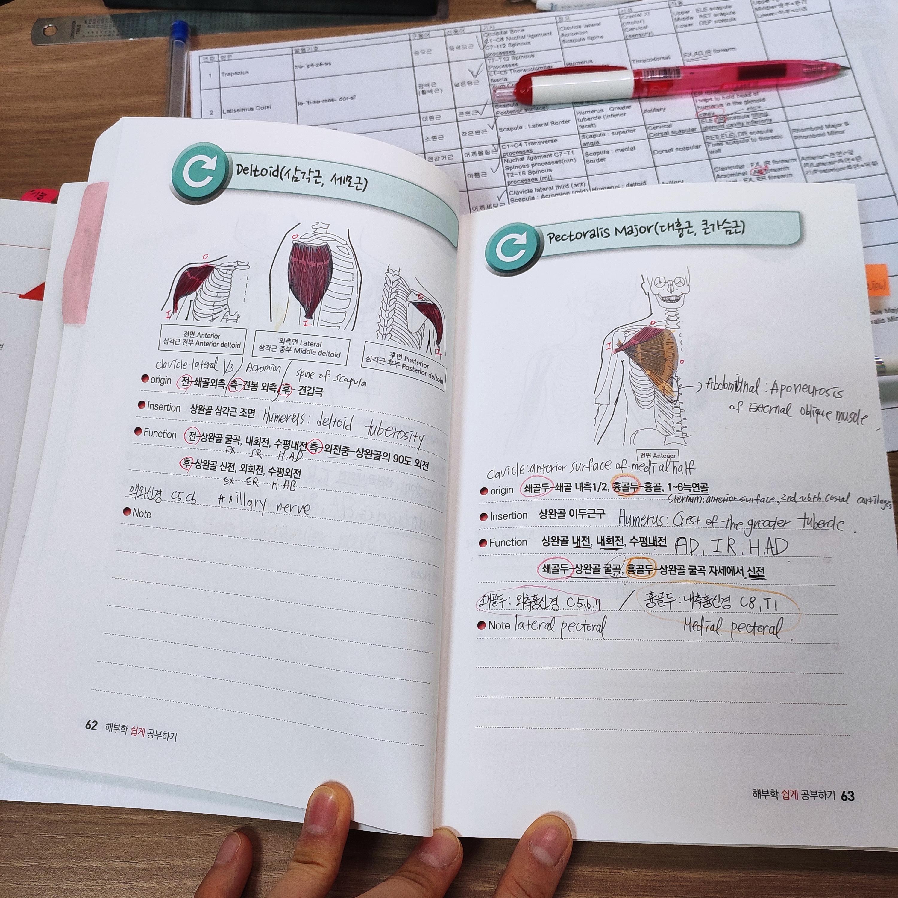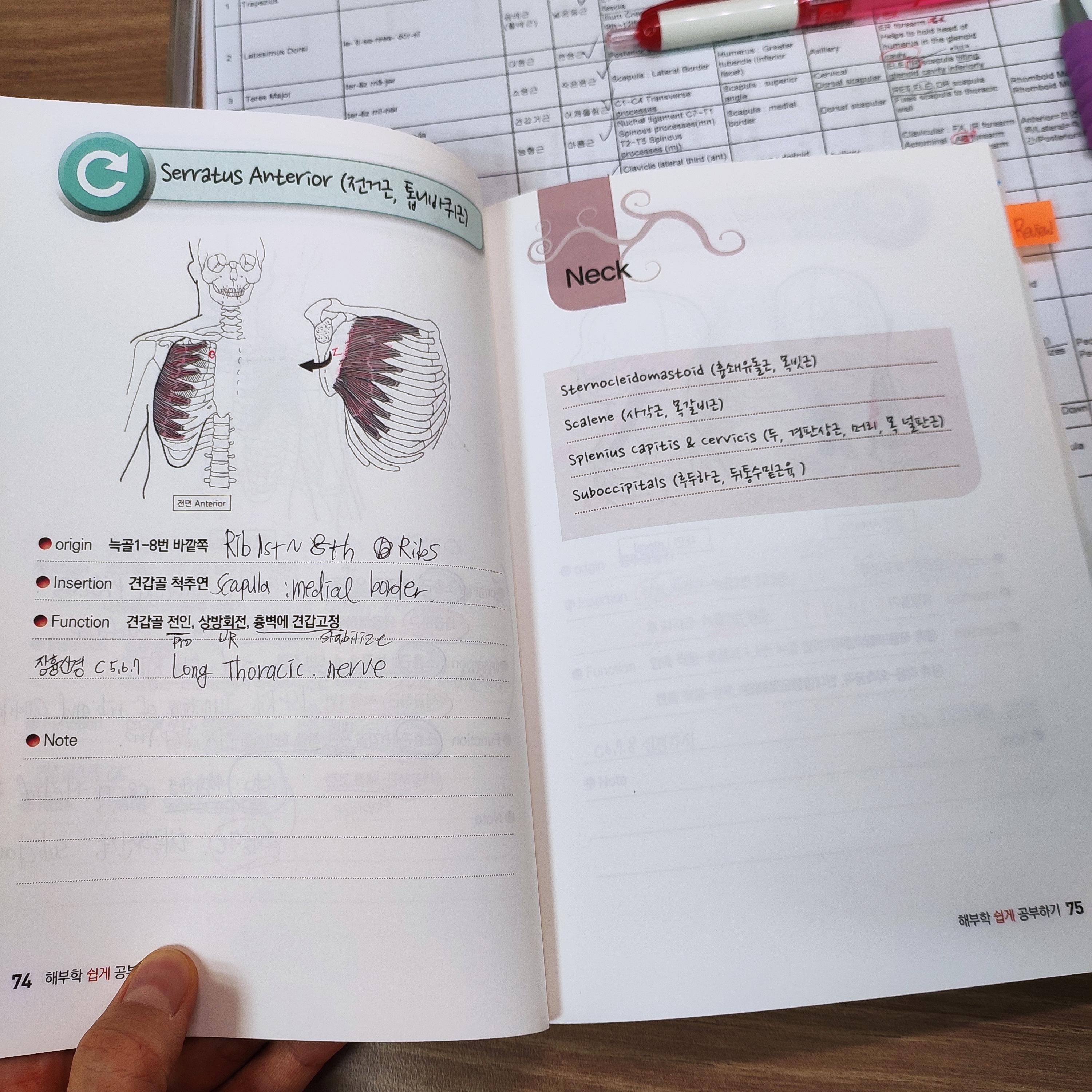 아직 다 써보진 않았지만 상체는 거의 다 제대로 봤다. 보면서 이상한 점이나 뭔가 대충 만들었다라는 느낌이 들지 않을 수가 없었다. 나는 영어로도 외우고 있어서 영어를 옮겨 적었고 근육에 색깔도 입혀 구분시켜놓았다.