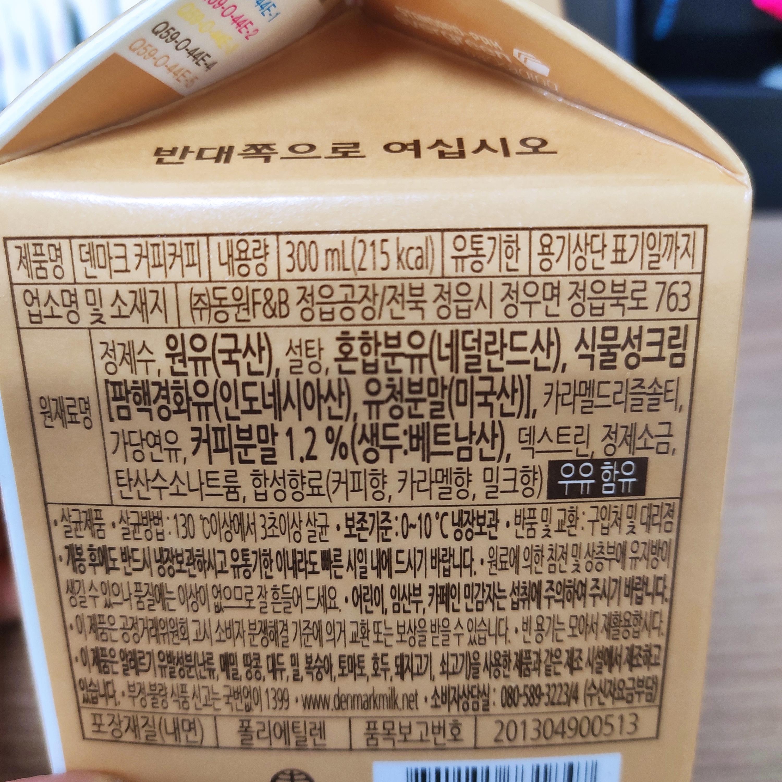 덴마크 커피커피 칼로리 215kcal . 고카페인 60mg . 포화지방 4.7g . 당류 29g