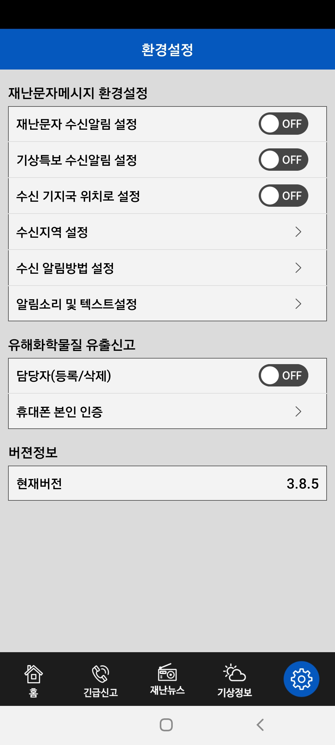 4. '환경설정 -> 수신지역 설정' 에 들어가 전국으로 설정을 off 시키고 원하는 지역으로 설정한다. 본인이 살고 있는 지역으로 설정해야겠지? 나중에 코로나가 혹여나.. 끝나서 다른 재난경보는 받아야 할 상황이 있을 것이니, 우선 지역설정을 해둔다. 부천은 인천이랑 너무 가까워서 인청경보도 같이 울려서 너무 알림 횟수가 잦았다. 이건 시청에서 보내는 것도 아니고 전화 기지국에서 보내는것이라 내가 위치만 조금 이동해도 타지역 알람이 뜰 수 있다. 그러니까 나는 부천에 계속 있으니 우선 지역 설정은 본인의 나와바리로 해준다.