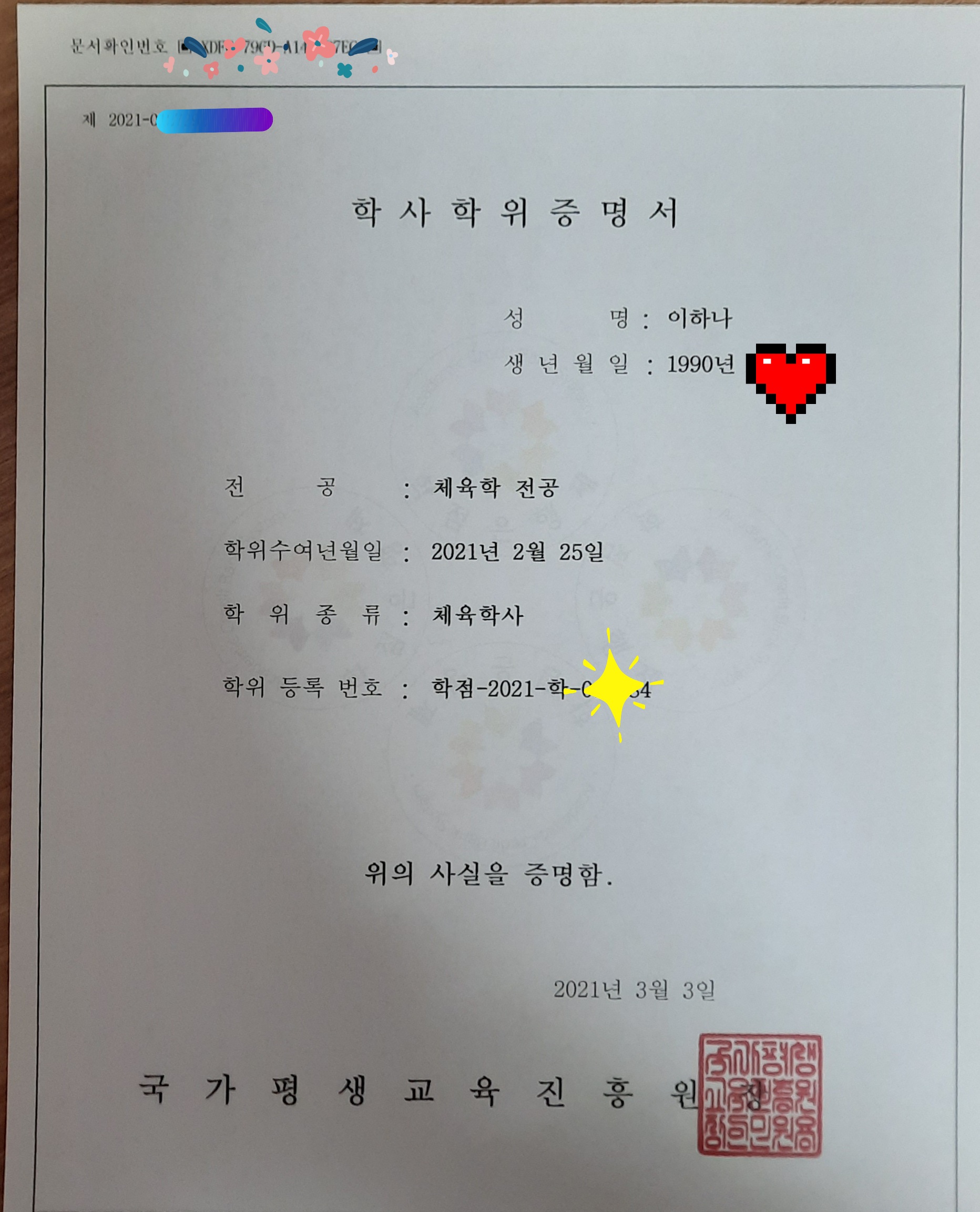 | 💜학점은행제 체육학사 2021년 2월 학위수여 신청 완료! 💜 (0) | 2020.12.15 |