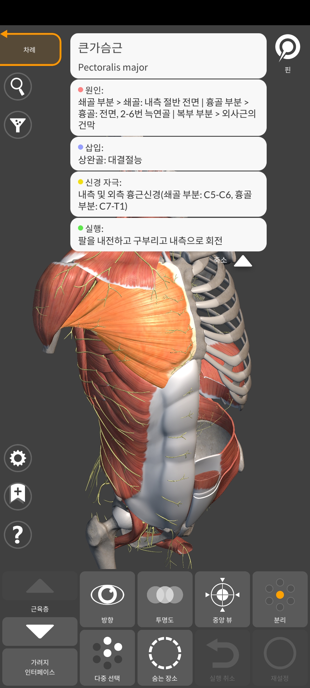 이는점(기시) 닿는점(정지) 작용 신경 전부 영어에서 한글로 업데이트되고 근육 층 별로 분리해서 보는거 편해졌다. 원래 버전보다는 확실히 디테일한 기능이 생겼다.