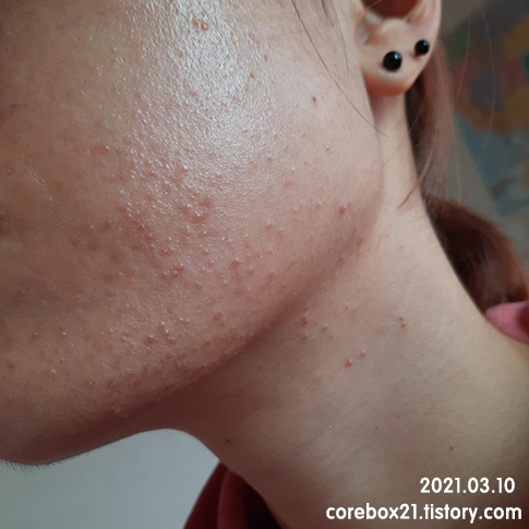 점점 세안하면서 턱에 많이져지는 좁살 여드름 개수가 줄기 시작함.