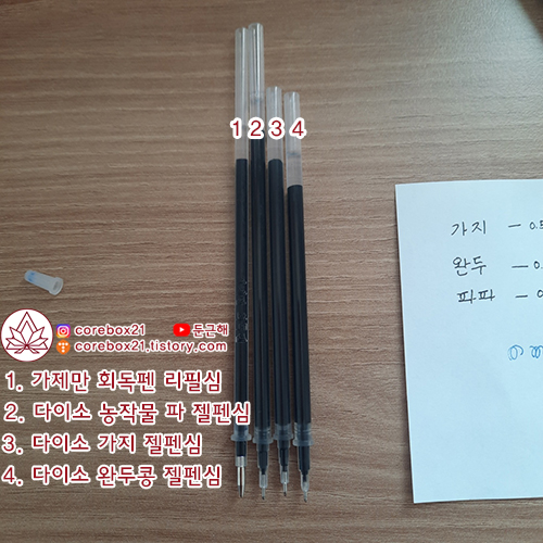그런데 파 펜은 그냥 쓰면 되는 길이고 나머지 가지랑 완두콩은 기화펜 심부분을 잘라 써야한다. 짧은 애들 기준으로 해서 기화펜심 바디를 잘라쓰면 될 것 같다. 가제만 회독펜 살 때 딸려오는 무료 공바디(아무것도 없는 볼펜몸)는 생각보다 그립감이 별루다.. 쫀독한 맛이 읎어서 사람들이 말캉한 바디의 펜과 많이 호환해서 쓰나보더라.