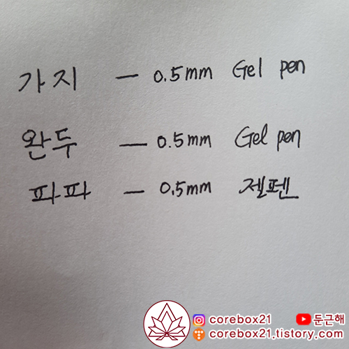 개인적으로 가지가 부드럽게 써지고 파는 괜찮은 편인데 저 종이에 적으니까 약간 거칠게 나왔다.