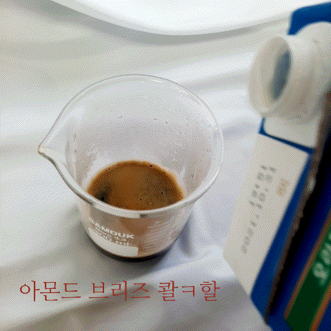 음 오늘은 크레마 좀 많이 날아가고 난 다음에 아몬드브리즈를 넣어서 거품이 많이 없어졌다.