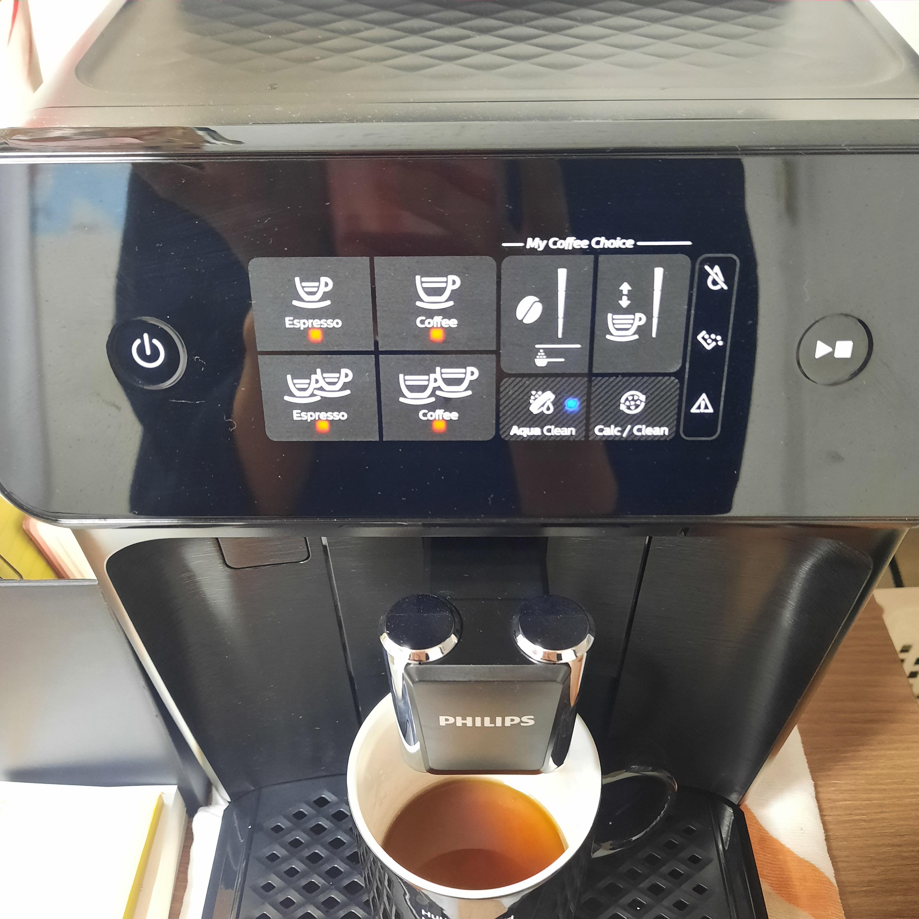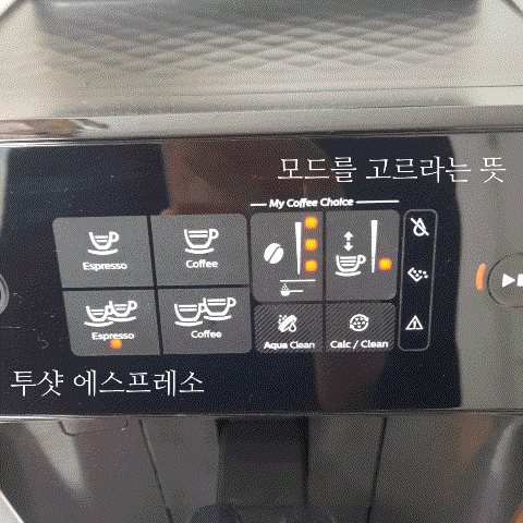 투샷 버튼을 누르면 바로 나오지는 않고 저기서도 또 마이 커피 초이스라해서 디테일하게 조절이 가능하다. 나는 진한 샷만을 원하고 물의 양은 적게 설정했다. 저 원두 모양과 커피컵 모양을 누르면 3단계로 조절 가능하다.