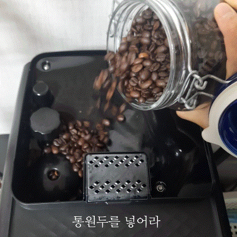 통 원두를 채워넣는다. 이 필립스 에소프레소머신의 특징?은 홀원두. 즉 통원두도 사용할 수 있고 이미 곱게 갈린 원두도 사용가능하다는 점! 그래서 입구가 따로 있다. 저 투명덮개에는 그라인디드 원두만 넣도록 한다.
