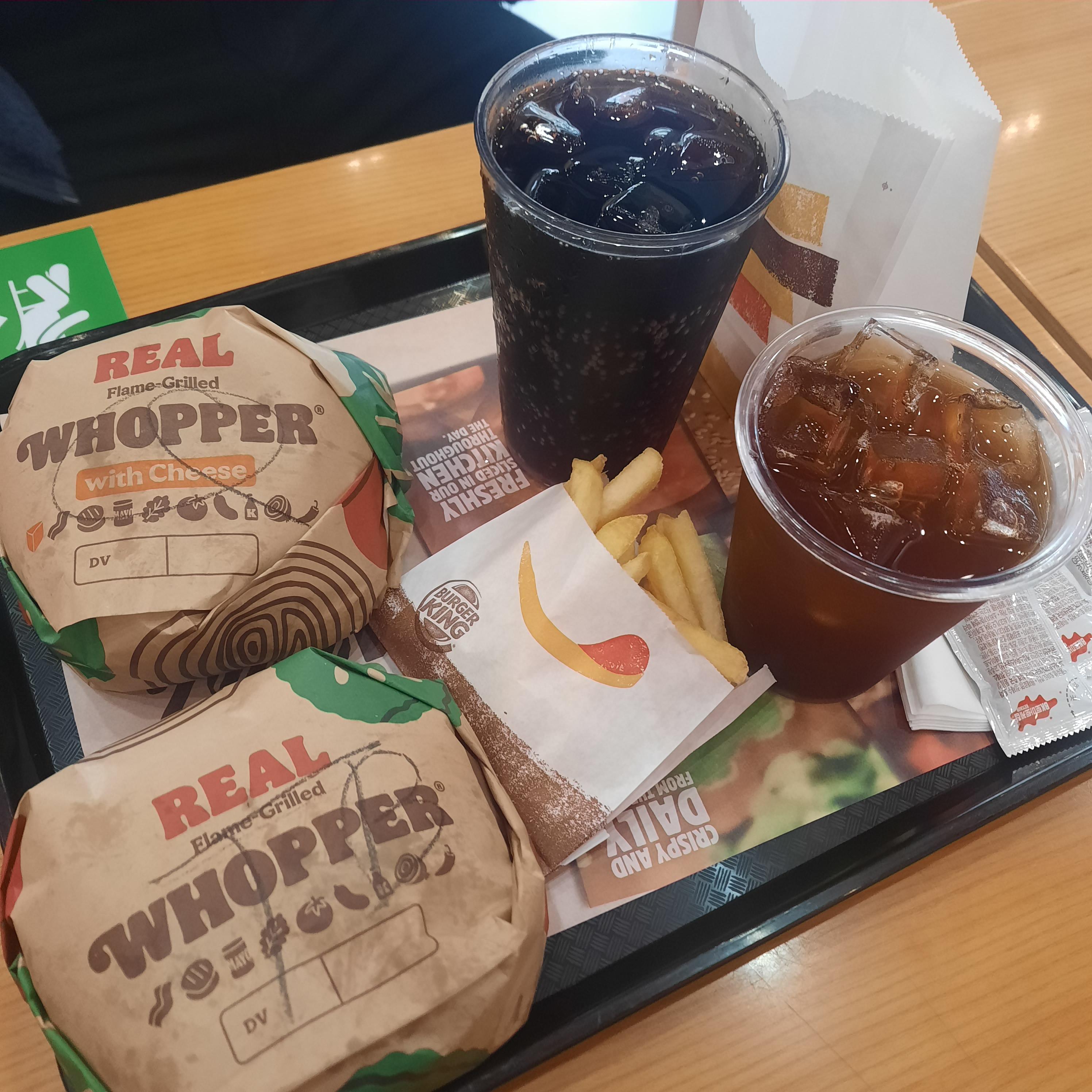 케도짱이 아침부터 느끼한게 먹고싶다고해서 콰트로치즈와퍼먹고 나는 오늘도 통베이컨와퍼를 처묵함.