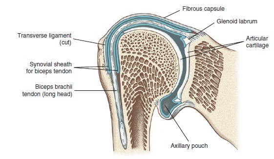 위팔두갈래힘줄 긴갈래를 보면 힘줄이 윤활집(Synovial sheath)로 감싸져있고 오목관절 테두리에서 시작됨을 알 수 있다. 섬유성 관절 주머니(fibrous capsule)에 둘러싸인 GH 관절의 주변 조직들.