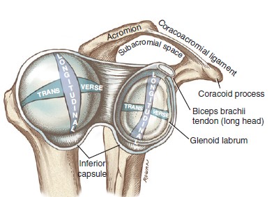 - 오목위팔인대 Superior Glenohumeral ligament : 해부목, 작은결절의 위에 부착. 가쪽돌림과 위팔뼈머리의 아래와 앞쪽의 병진운동의 제한을 제공 (팽팽하게 당기는)