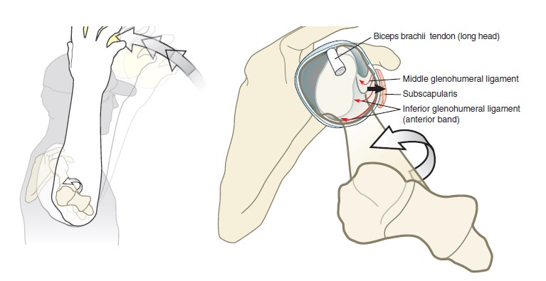 - 코킹단계 : 오목위팔관절 벌림 + 가쪽돌림이 일어남. 중간오목위팔인대와 아래오목위팔인대의 앞섬유(어깨밑근의 하단쪽)를 비틀고 신장시킴. 이렇게 신장된 인대들과 어깨밑근에서의 장력은 자연스럽게 앞쪽 병진운동을 저항하게 됨.