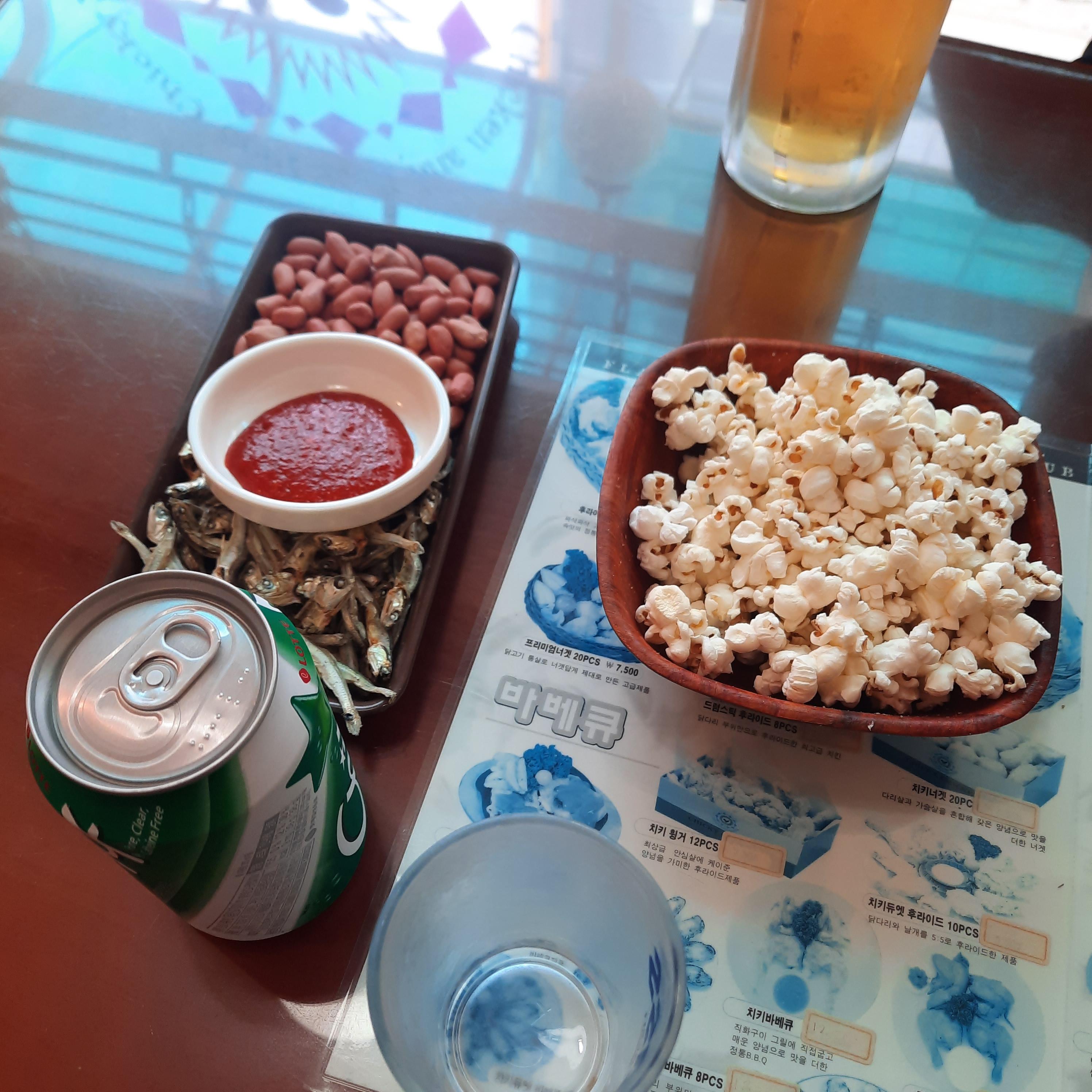 기본안주는 땅콩, 마른멸치, 초장 그리고 팝콘!