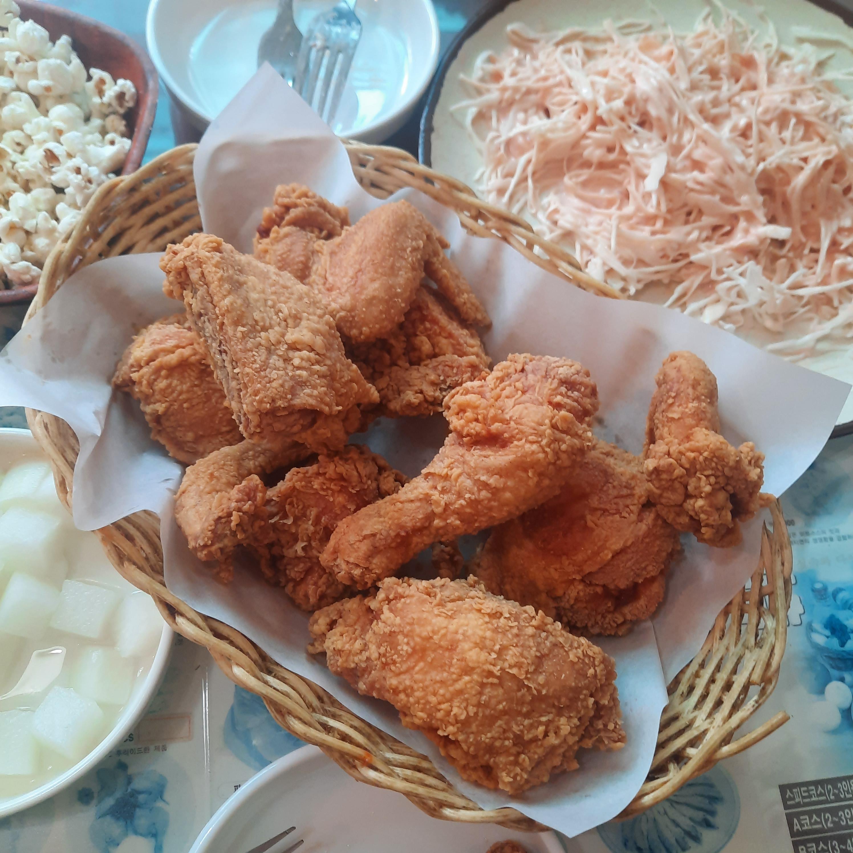 맛있었던 메뉴는 케이쥰샐러드🧡, 기본 프라이드 치킨, 노가리만 먹어봤는데 셋 다 맛잇었음.