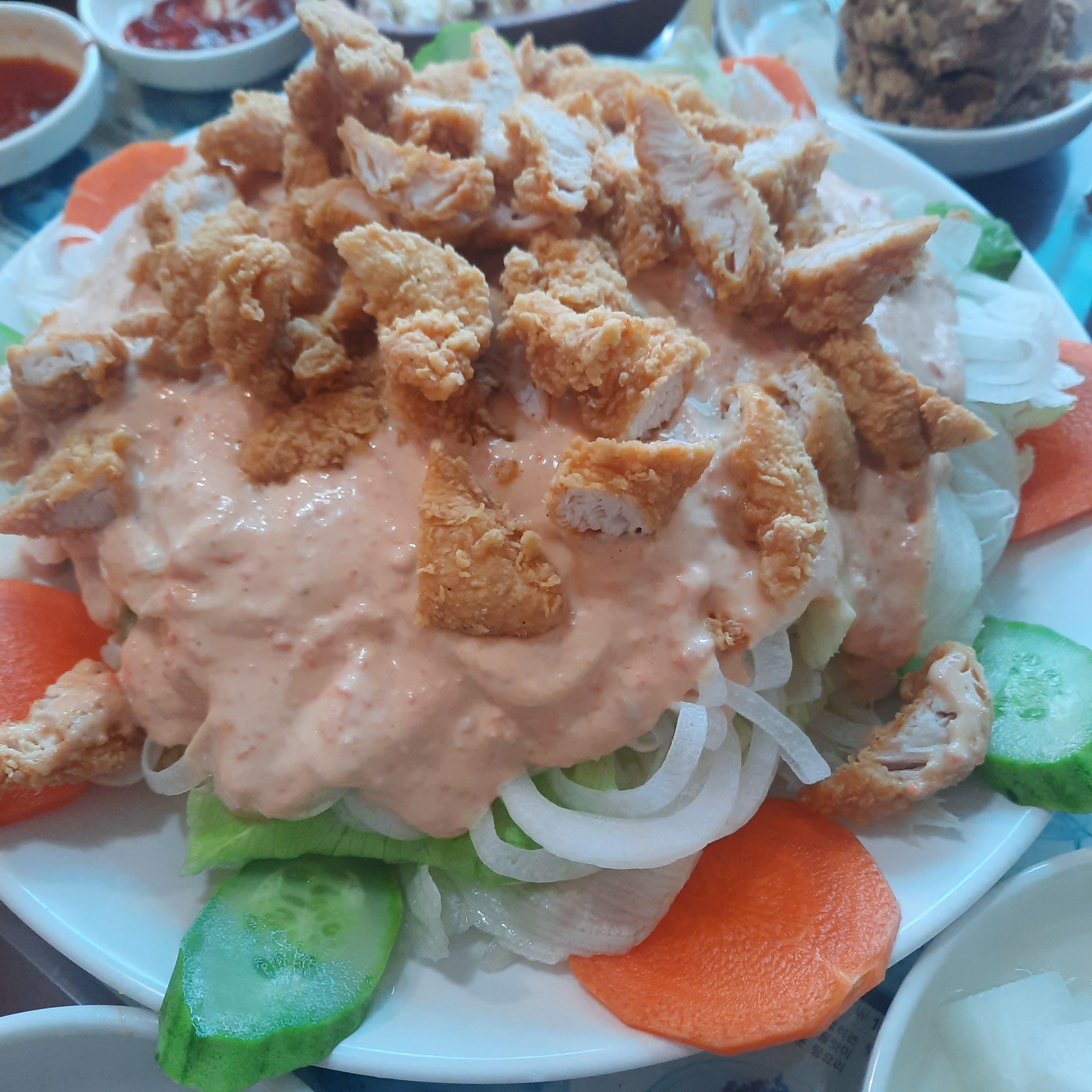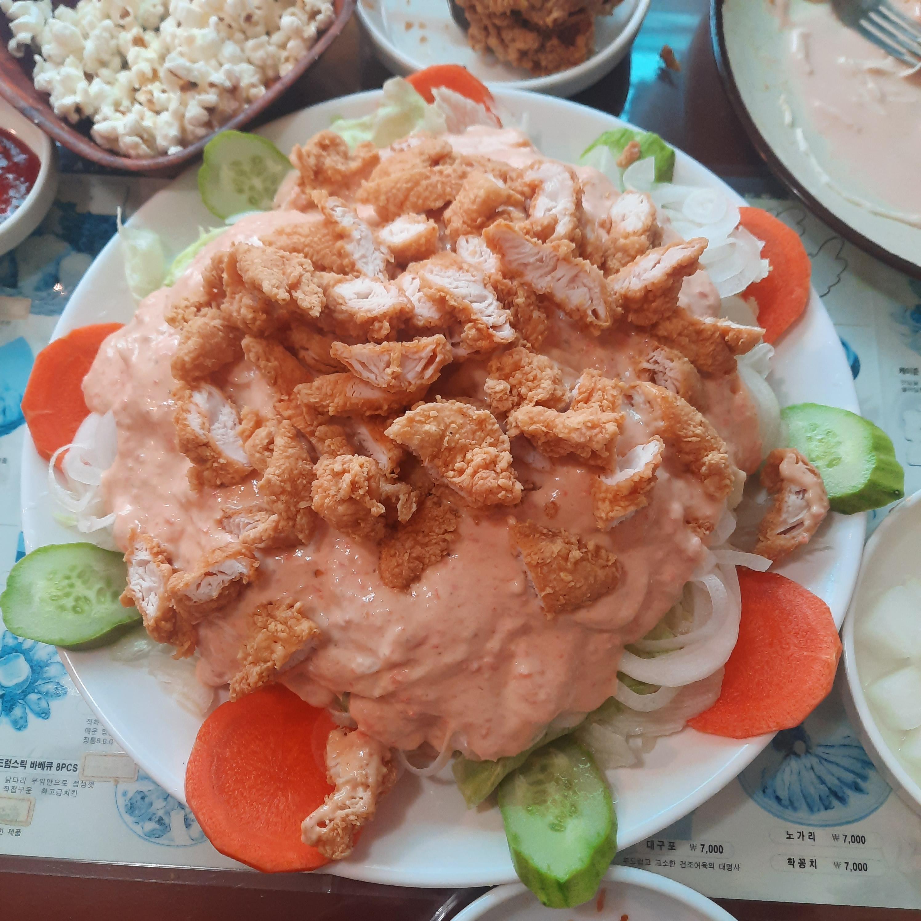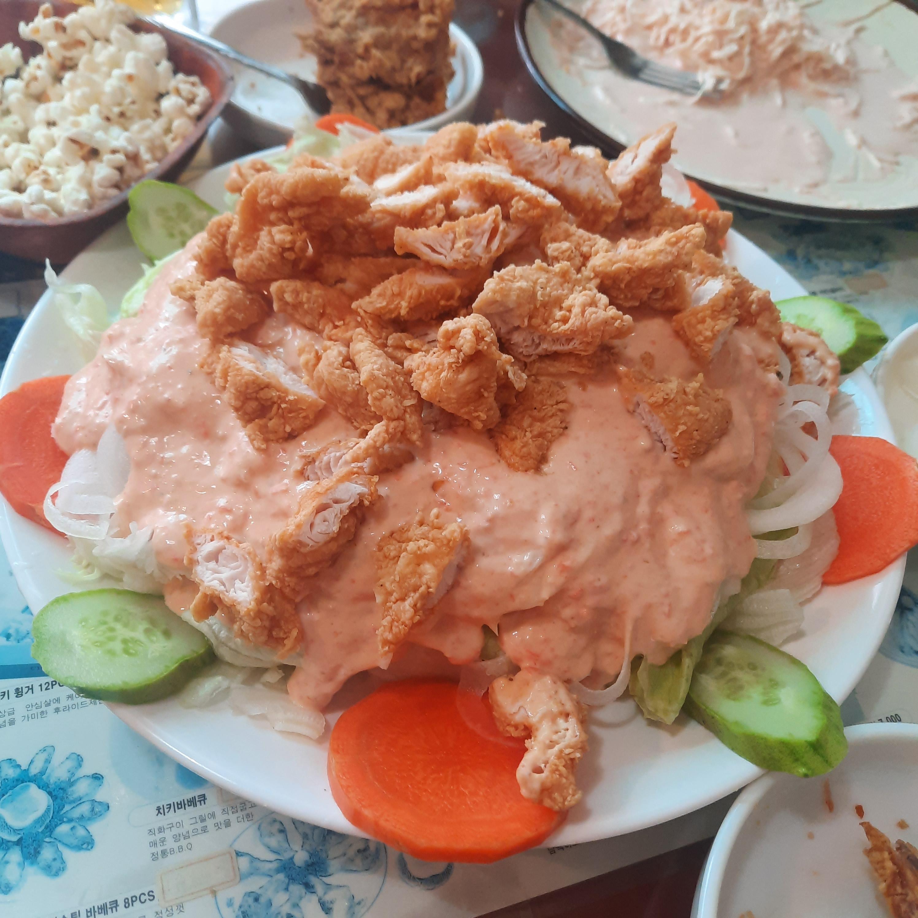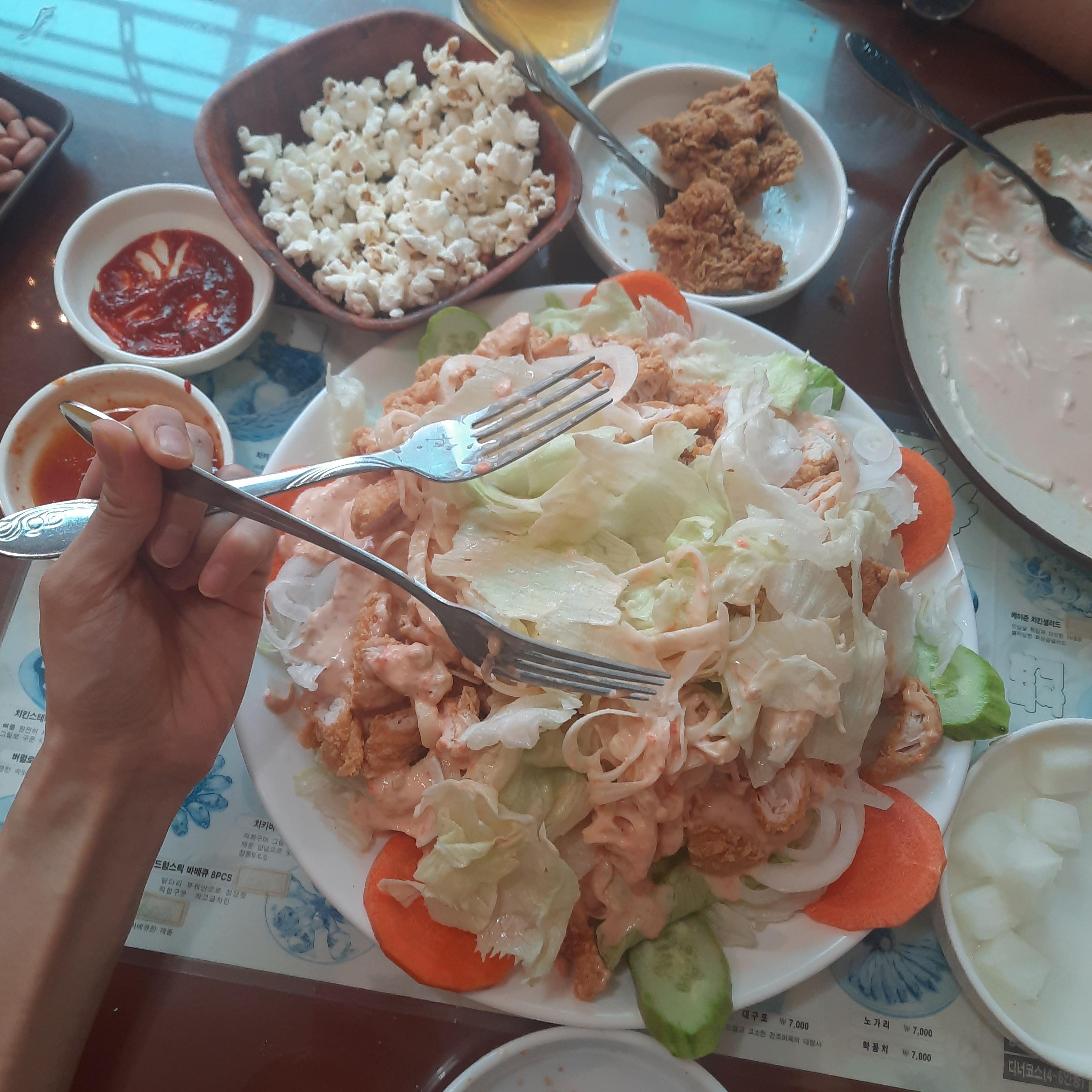 비쥬얼 봐... 이거 내 20대 선정 최고의 호프집 음식!ㅋㅋㅋ 술도 못먹는데 몇군데 따라가서 먹은거 치곤 세상 제일 맛있었음. 양이 진짜 어마어마하다. 양파 슬리이스랑 양상추, 닭 안심튀김, 데코ed 오이와 당근... 너무 너무 마시쪙..
