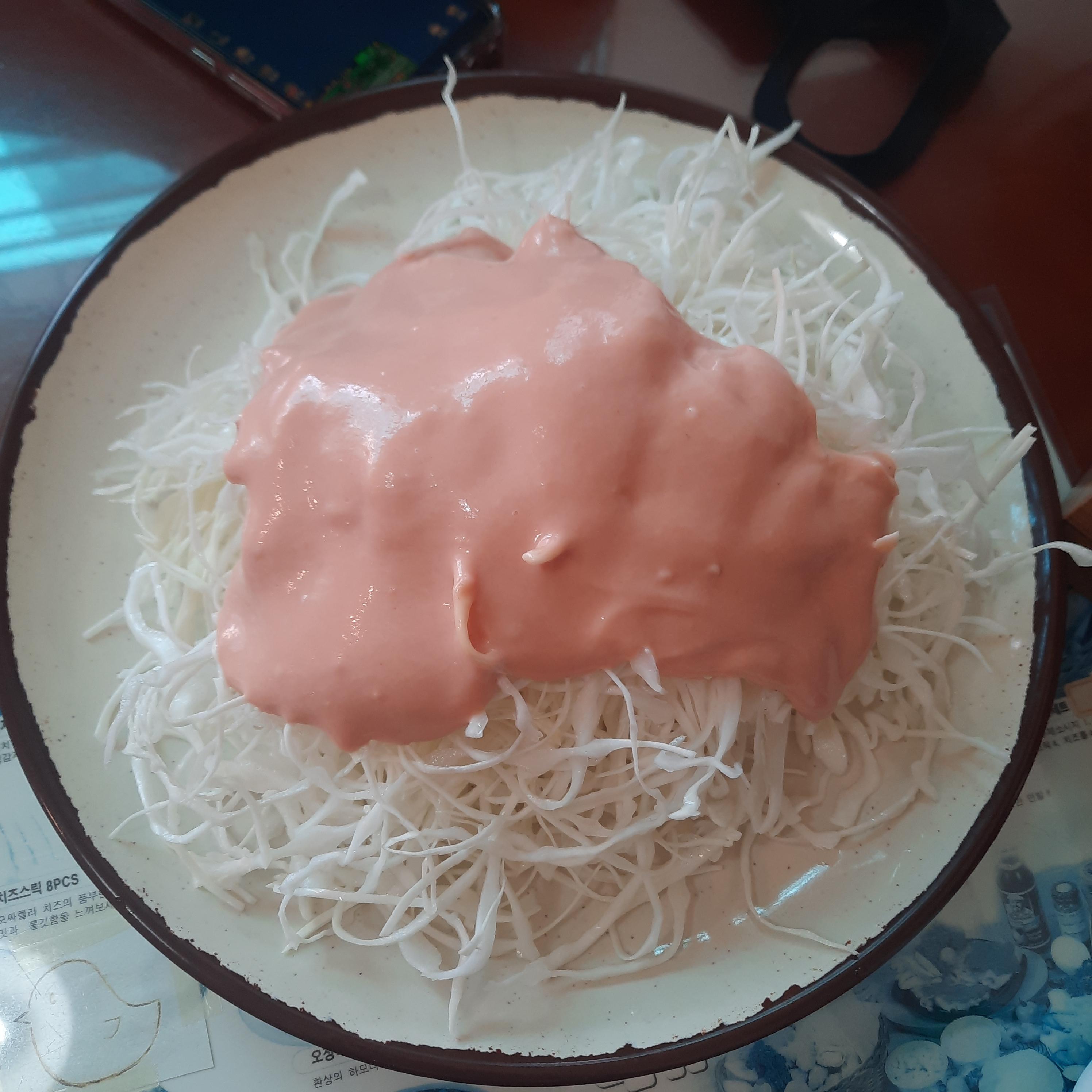 그리고 대망의 기본안주로 나오는 캐챱+마요네즈 양배추 샐러드...!!! 후부ㅜㅋ후쿱후무 흡입함. 히히