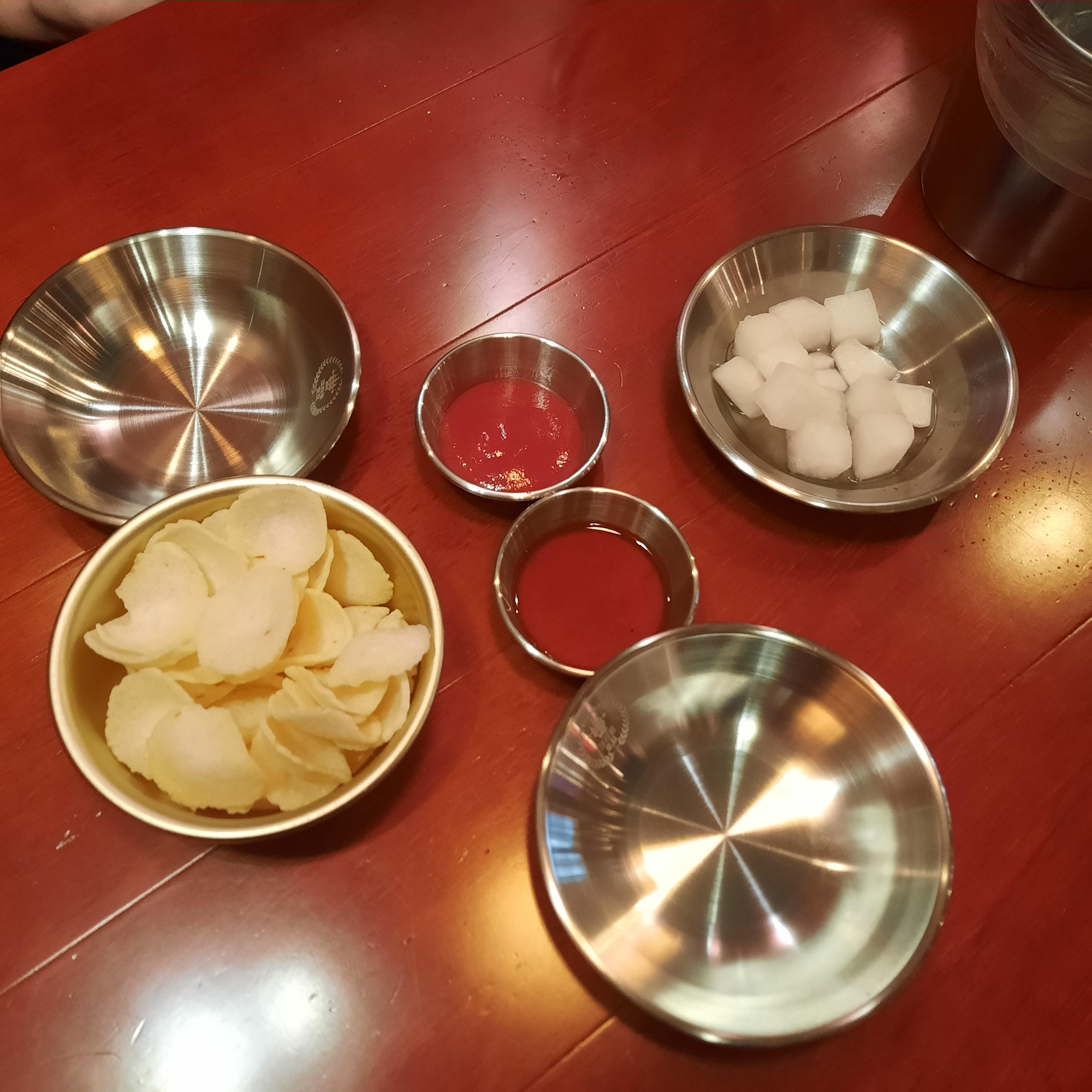 쌀 뻥튀기인지... 알새우칩 같은 과자가 나온다. 케챱이랑 칠리 소스. 무의 양은 아주 적은 편이다.