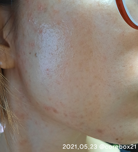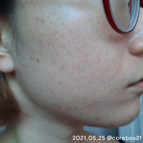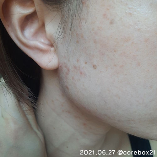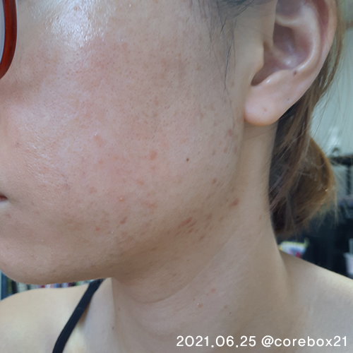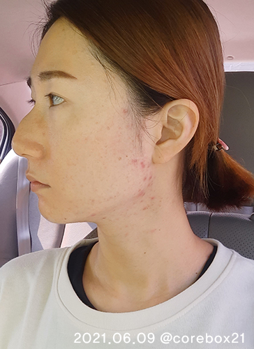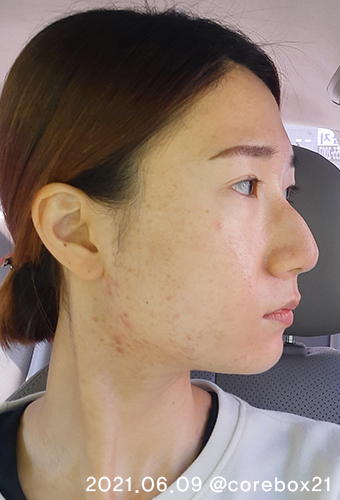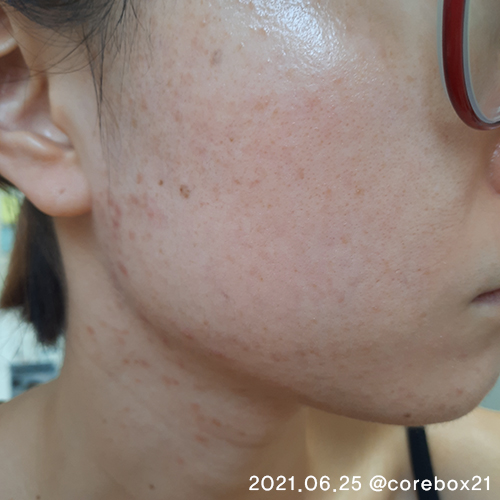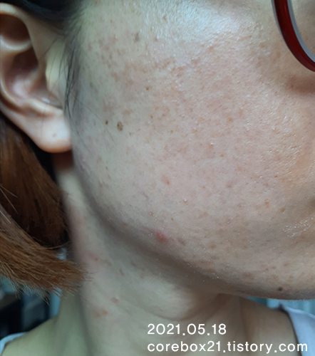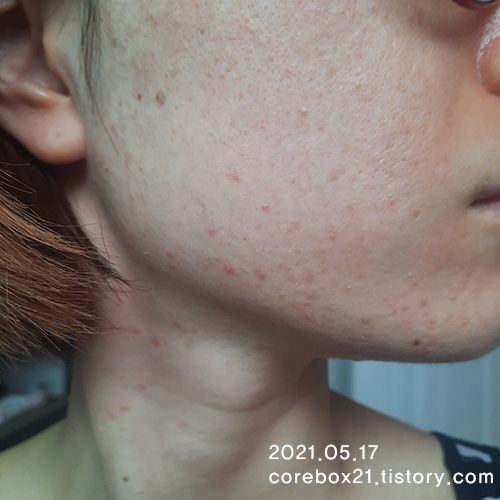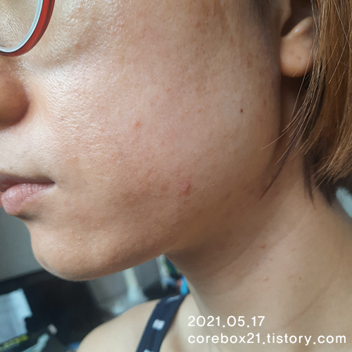 5월말이랑 비교해서 큰 차이가 있는건 아닌것 같지만 이 때도 세안할 때 피부가 좋아진걸 느낌. 우선 짜잘한 좁쌀 여드름이 많이 없어짐. 왼쪽 입에 완전 익은 여드름 하나가 잉네